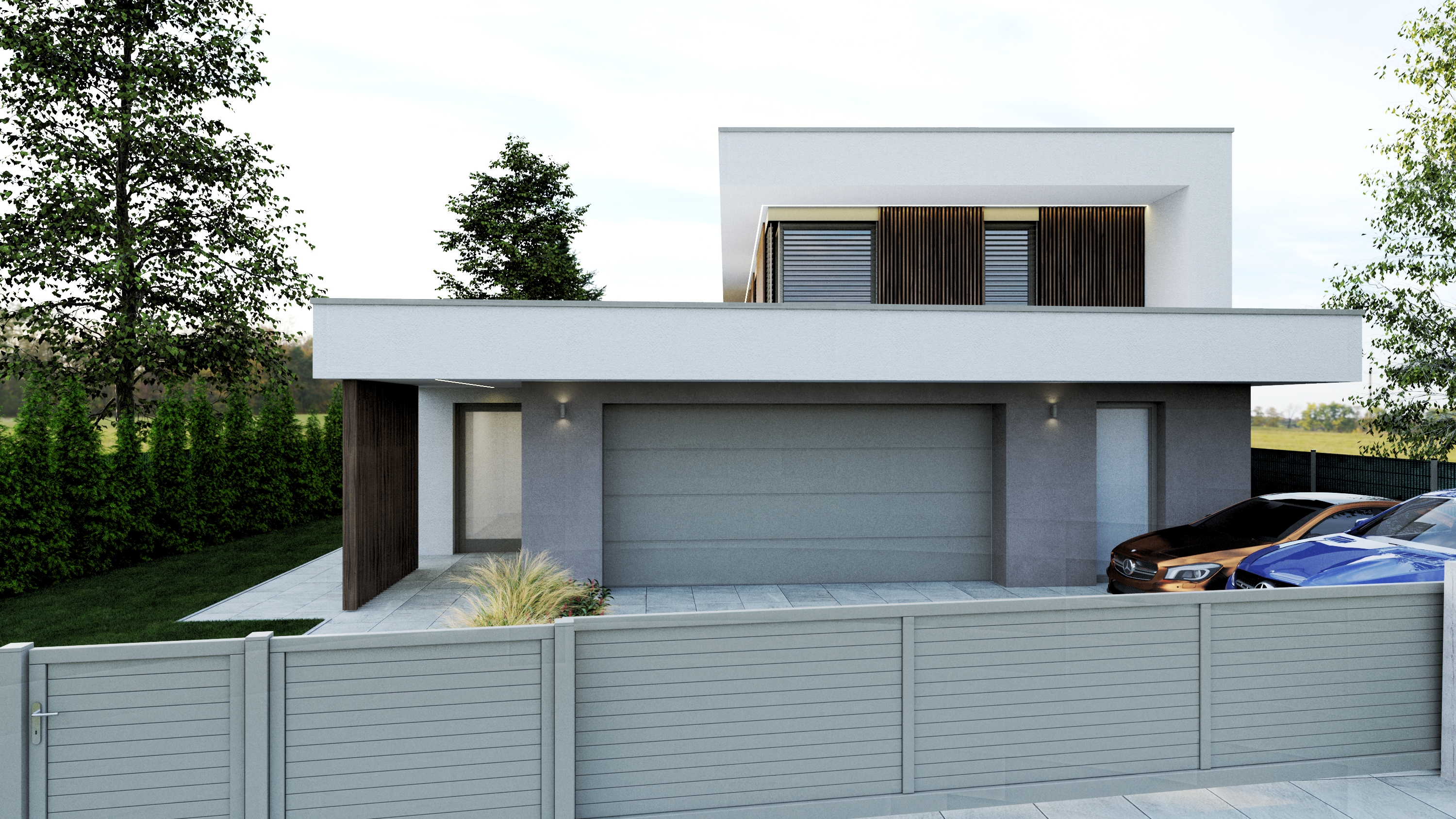modern minimalist house with a sleek design featuring a white and light gray exterior the front of the house has a garage with a matte gray door incorporate dark wood elements for contrast the surrounding landscape includes lush dark green trees and a well maintained grass lawn a fence in the foreground should be a muted gray include parked cars one with a metallic copper color the other in a deep blue shade the atmosphere is serene and contemporary with soft daylight illuminating the scene make a hypperrealistic render