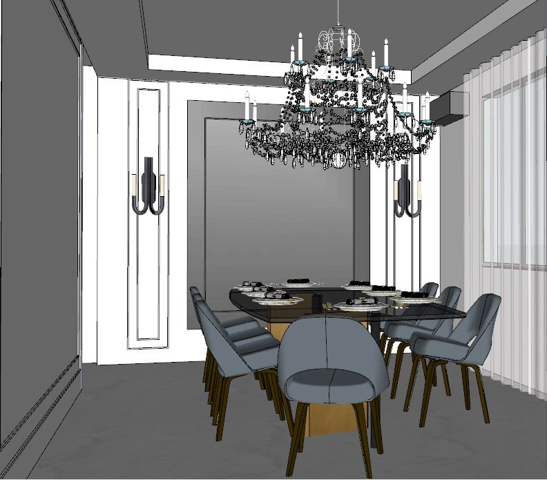 maintain colors as in the picture add light to ceiling and chandelier on the right side of the picture add daylight floor tiles are white top of the dinning is glass tinted and the chairs are dark blue legs of the dinning chair are black legs of the dinning table are brass and black behind the dinning table a big mirror and add light to the applique on the wall