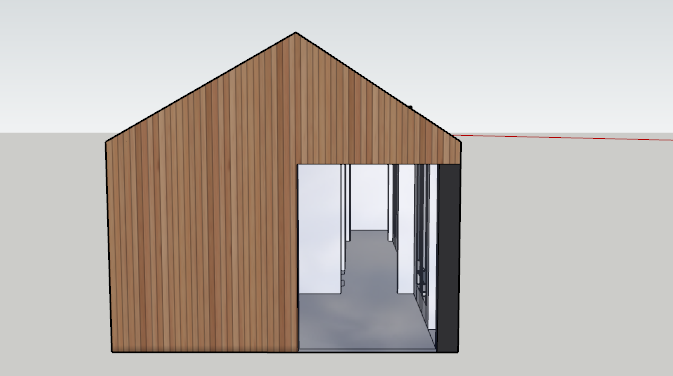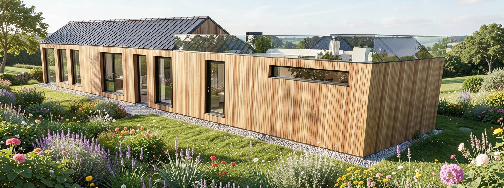 make realistic glass balcony black roof tiles to the apex and cedar wood cladding windows and doors to be black with clear glass place the background in the countryside with lovely landscaping