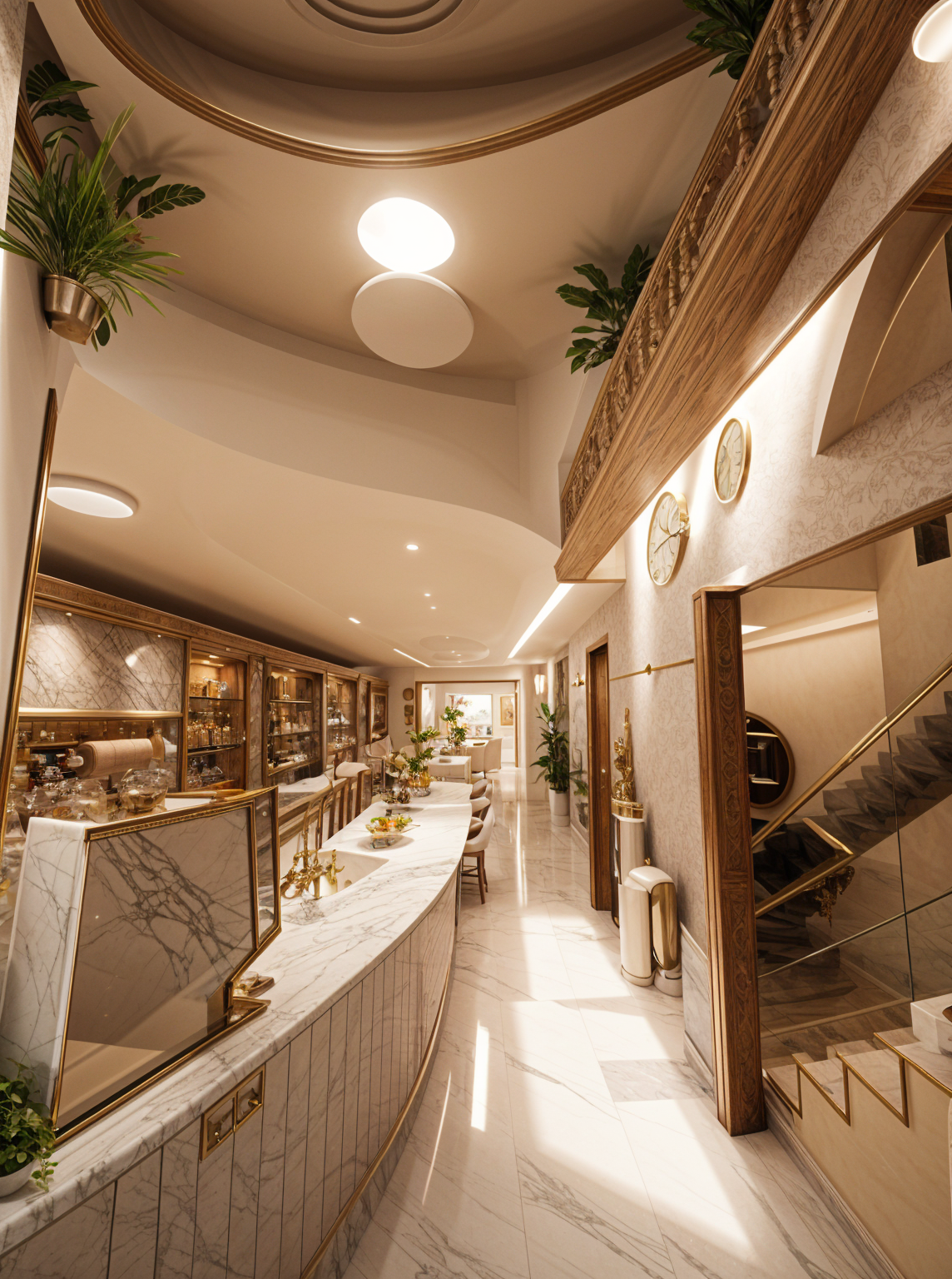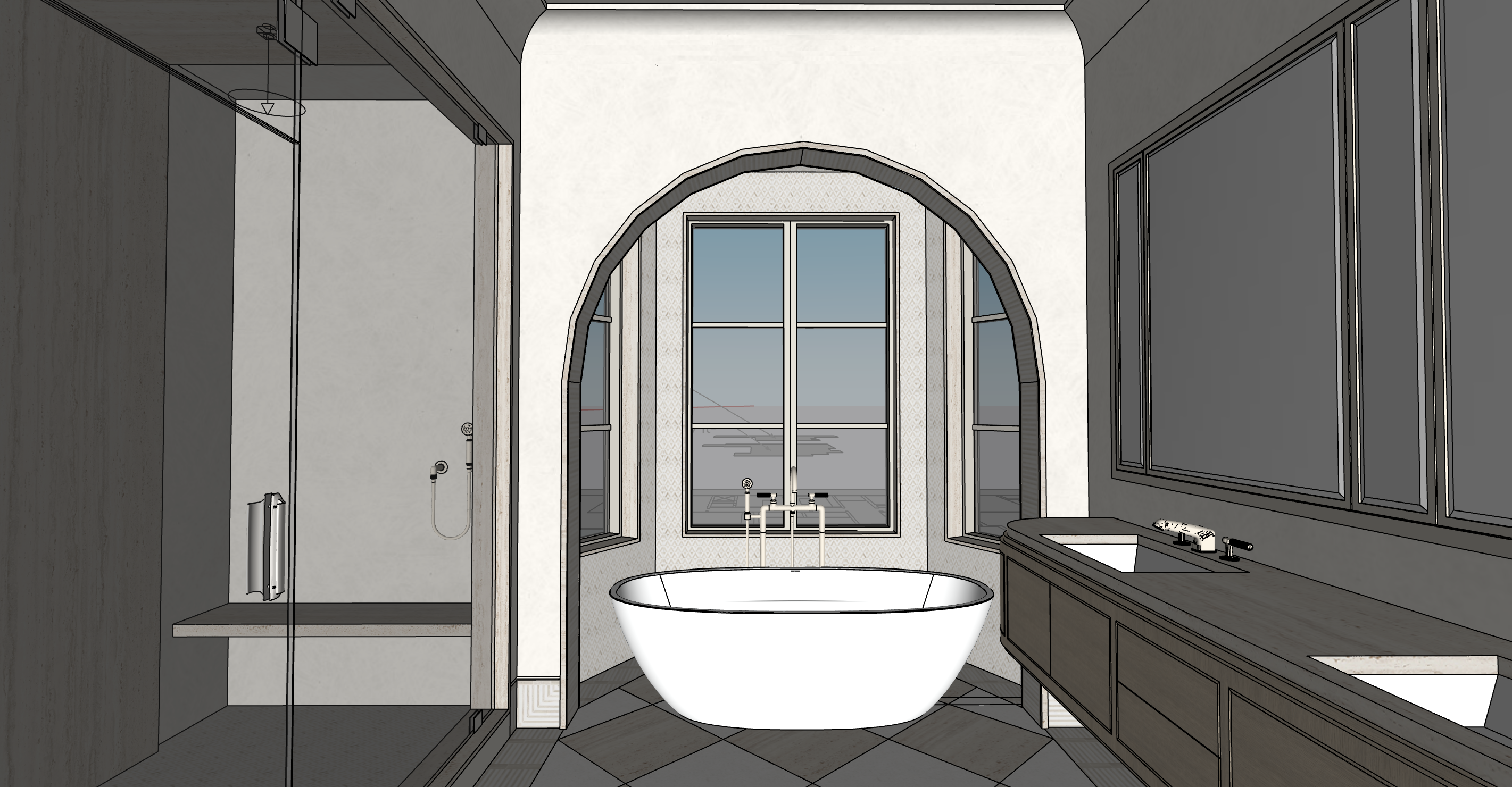 interior shot off white limewash walls whitewashed white oak vanity inset cabinetry with bead border around each cabinet door flat cabinet doors white washed white oak to match floor is diamond pattern with thassos marble and travertine marble the arch has a marble mosaic cladding that is a combination of thassos and travertine the mirror is polished nickel frame the plumbing fixtures are polished nickel the vanity countertop is travertine shower material is off white limewash to match bathroom walls windows are beige framed