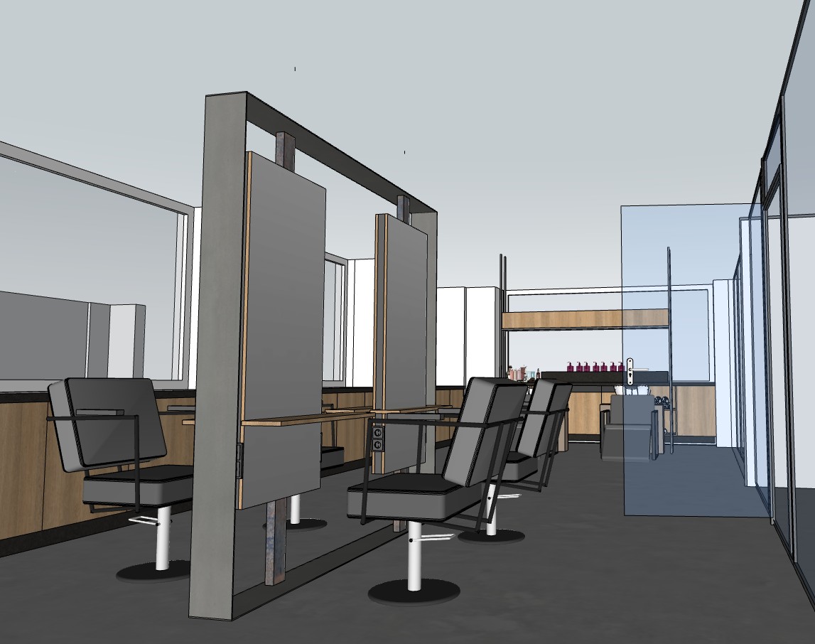 dies ist das bild eines friseursalons bitte die m bel nicht ver ndern so lassen wir sie sind der spiegel arbeitspl tze ist 120 zentimeter breiter 5 millimeter dicker stahlrahmen der roh nicht behandelt ist mittig links und rechts h ngen jeweils einen spiegel 1 60 70 zentimeter hoch der ganze platz ist 2 meter breit 220 hoch in h he von 80 cm befindet sich ber die breite der spiegel eine 3 zentimeter dicke massive eichenholzplatte mit baumkante seitlich an den spiegeln befinden sich die steckdosen davor stehen graue st hle mit pumpen und schwarzem unterteil der ganze friseursalon ist mit betonfarbenem bodenbeschichtung glattboden gemacht die im hintergrund sind an einer wand lange fenster mit teilweise sideboard schenken die mitritfarbenen schieferarbeitsfl chen ausgesehen sind die t ren sind aus eichel massiv wiederum push to open der sockel selbst ist wieder aus schiefer hinten im hintergrund sieht man die waschanlagen die denselben design haben wie die st hle dieser haben auch graue sitzpolster und wei e waschbecken umrahmt werden auch diese waschbecken von einer metallstruktur hnlich wie der der arbeitspl tze wo sich auf einer h he von ein meter 70 ein massiv eichener kasten befindet der von der nicht sichtbaren seite hohl ist rechts vom bild ist eine glaswand mit eingelassenen glast ren hier geht es zu weiteren r umen