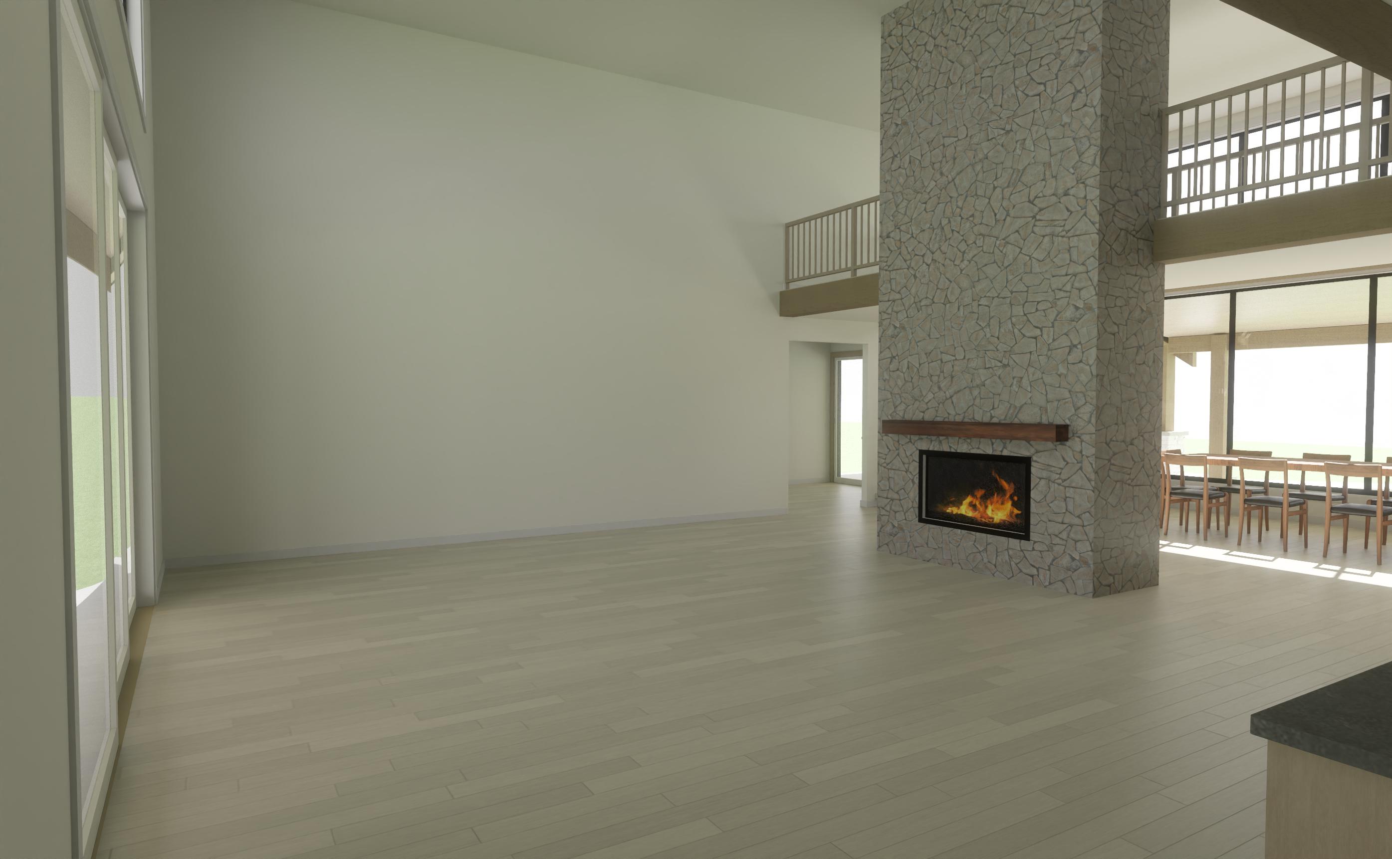 t s important to keep the sizes of everything the same change textures and materials but keep the sizes of everything the same make rock realistic its important to keep to scale this room is big do not change size of windows or doors do not add doors or windows do not change or add fixtures modern warm minimalist interior open living space wide plank white oak flooring soft natural sunlight casting long shadows across floor black steel framed glass partition wall floor to ceiling glass panels with thin mullions neutral color palette creamy white walls light taupe curtains contemporary living room with low profile white sofas warm wood floating shelves with minimal decor plaster fireplace with simple mantle soft ambient lighting large potted indoor tree clean lines high end residential design scandinavian modern aesthetic ultra realistic architectural visualization 8k detail exterior views are western montana add hearth to fireplace furniture should be close to camera the camera is in the corner and there is a couch there add living room furniture add a rug place art on wall