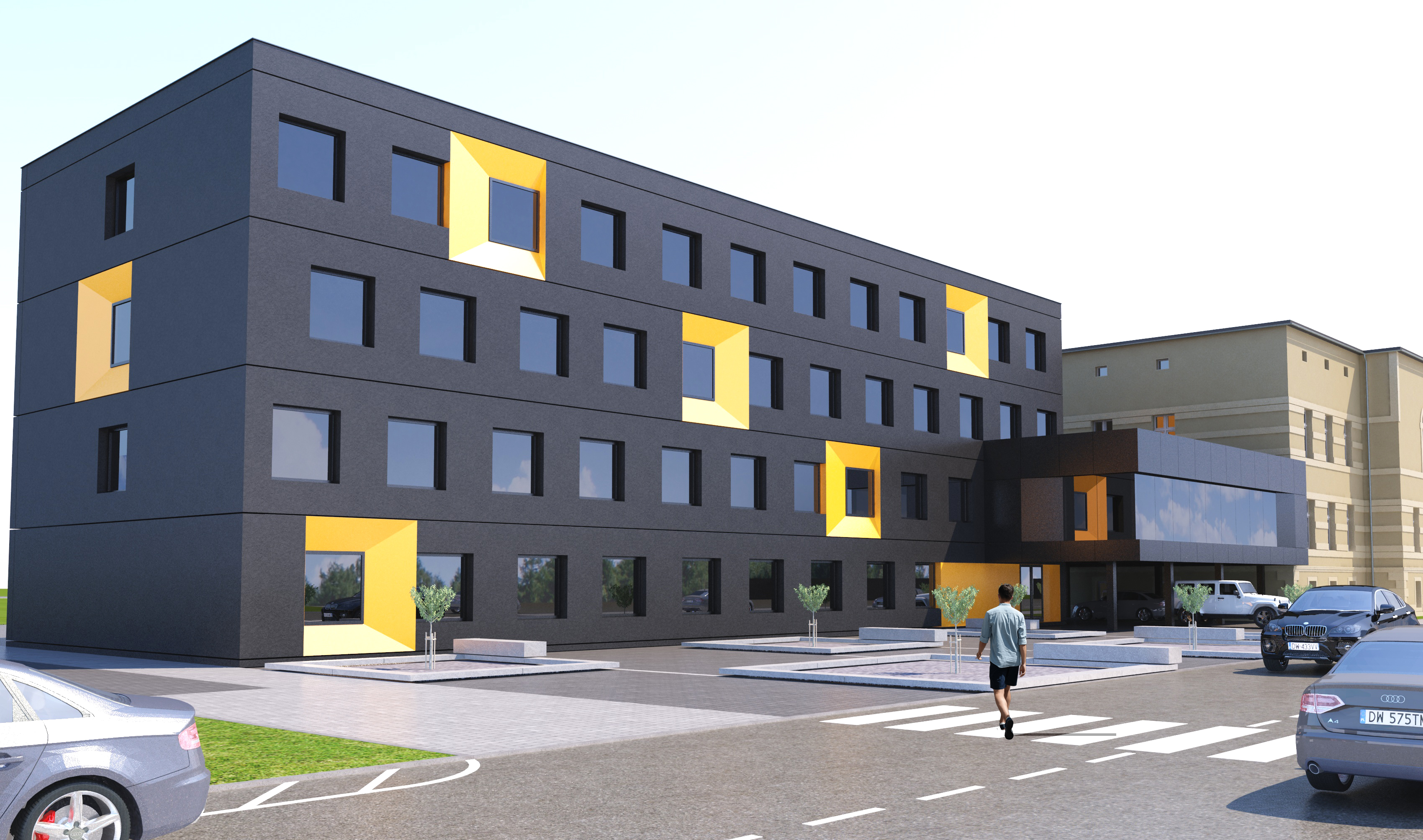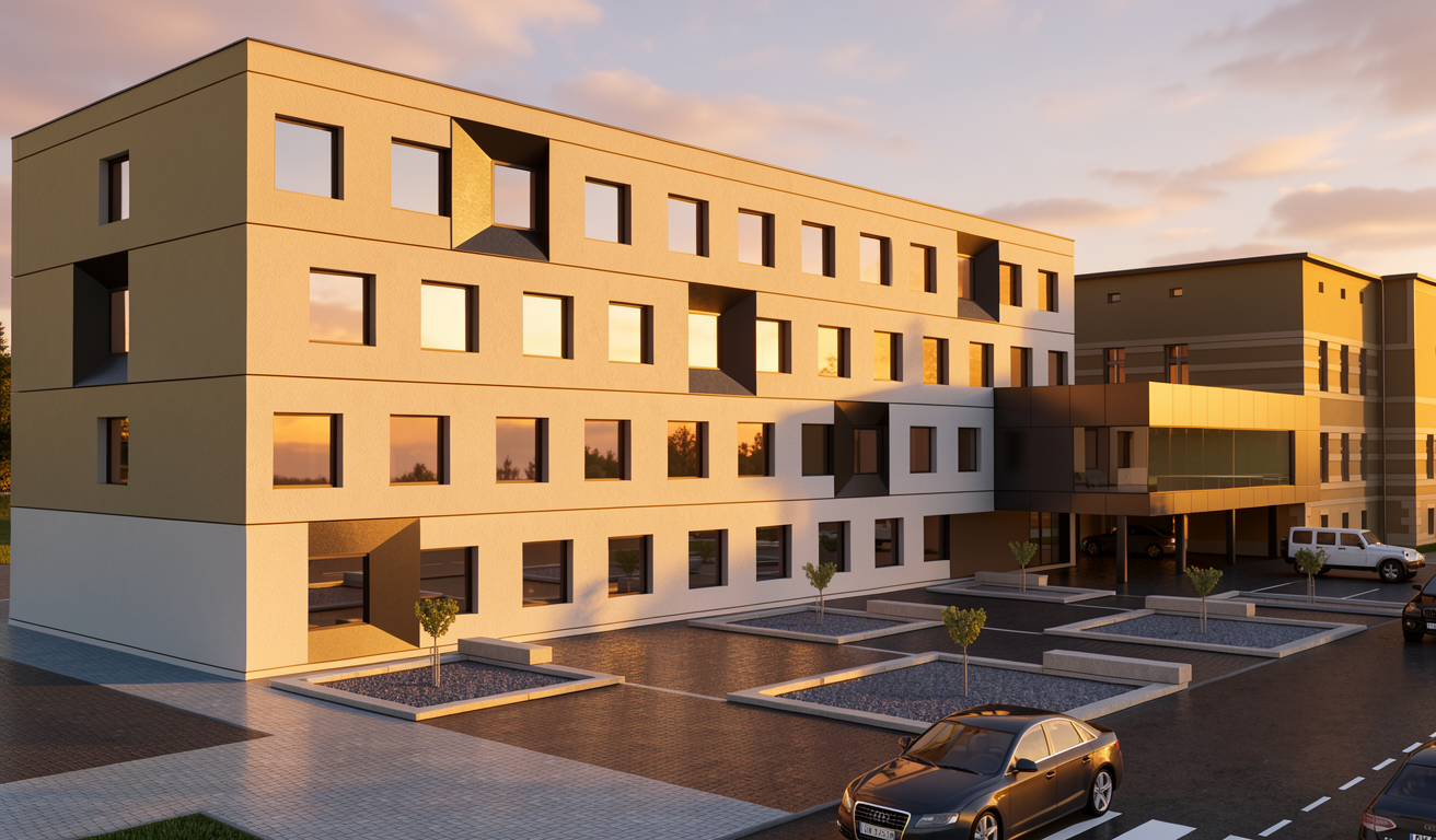 create a photorealistic view without changing the shape of the building the inscriptions and the colors of the facade do not add any text or graphic signs do not add any inscriptions on the facade add warm atmospheric daylight do not add any subtitles winter view