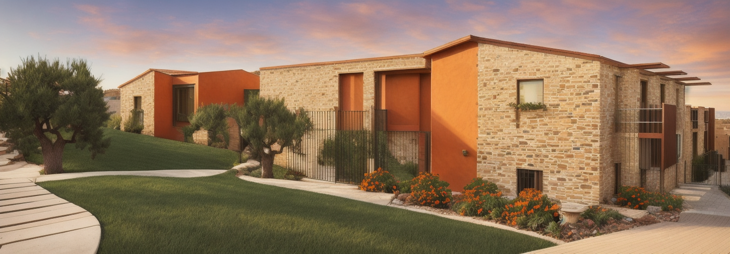 carlo scarpa exterior shot the fences in the front side are orange corten the balconies on the side of the building have wooden fences there are no stairs at the entrance the entrance is from a grassy garden there is a grassy garden in front of the building the fa ade is made from brown stone and orange concrete architecture