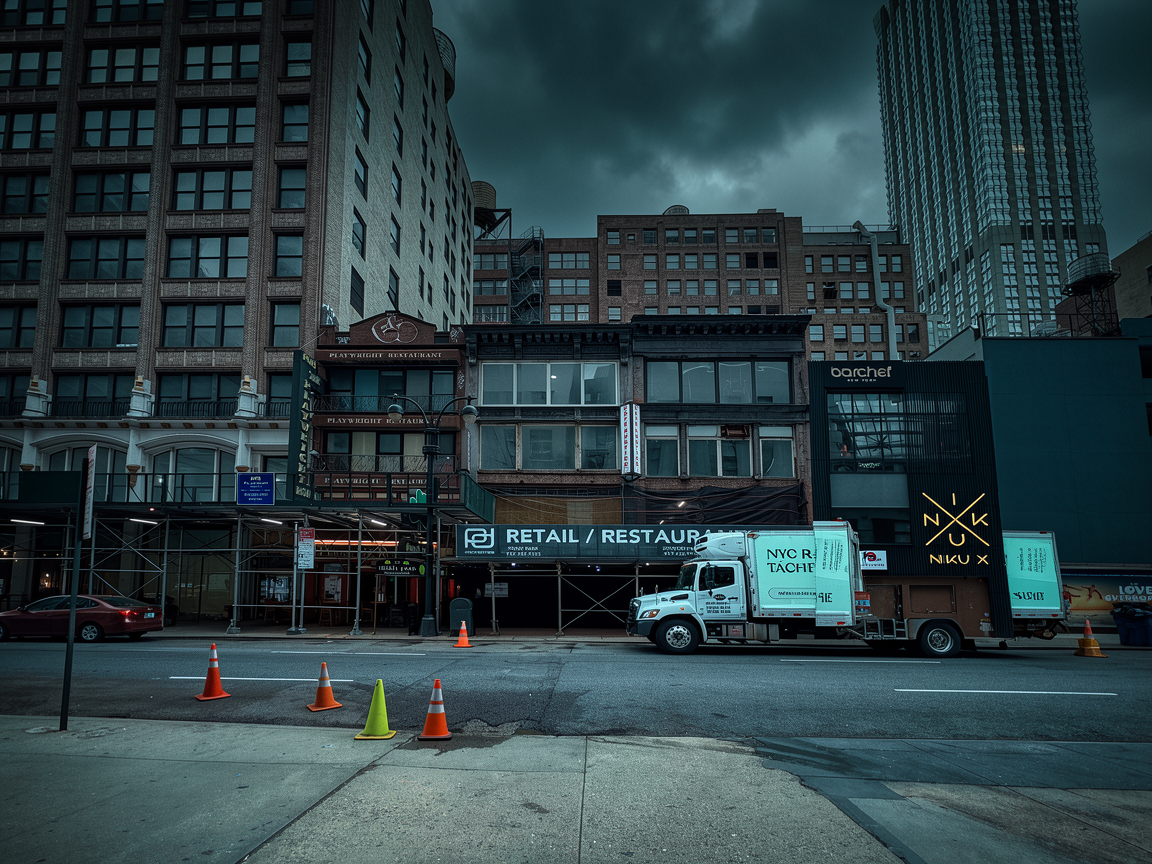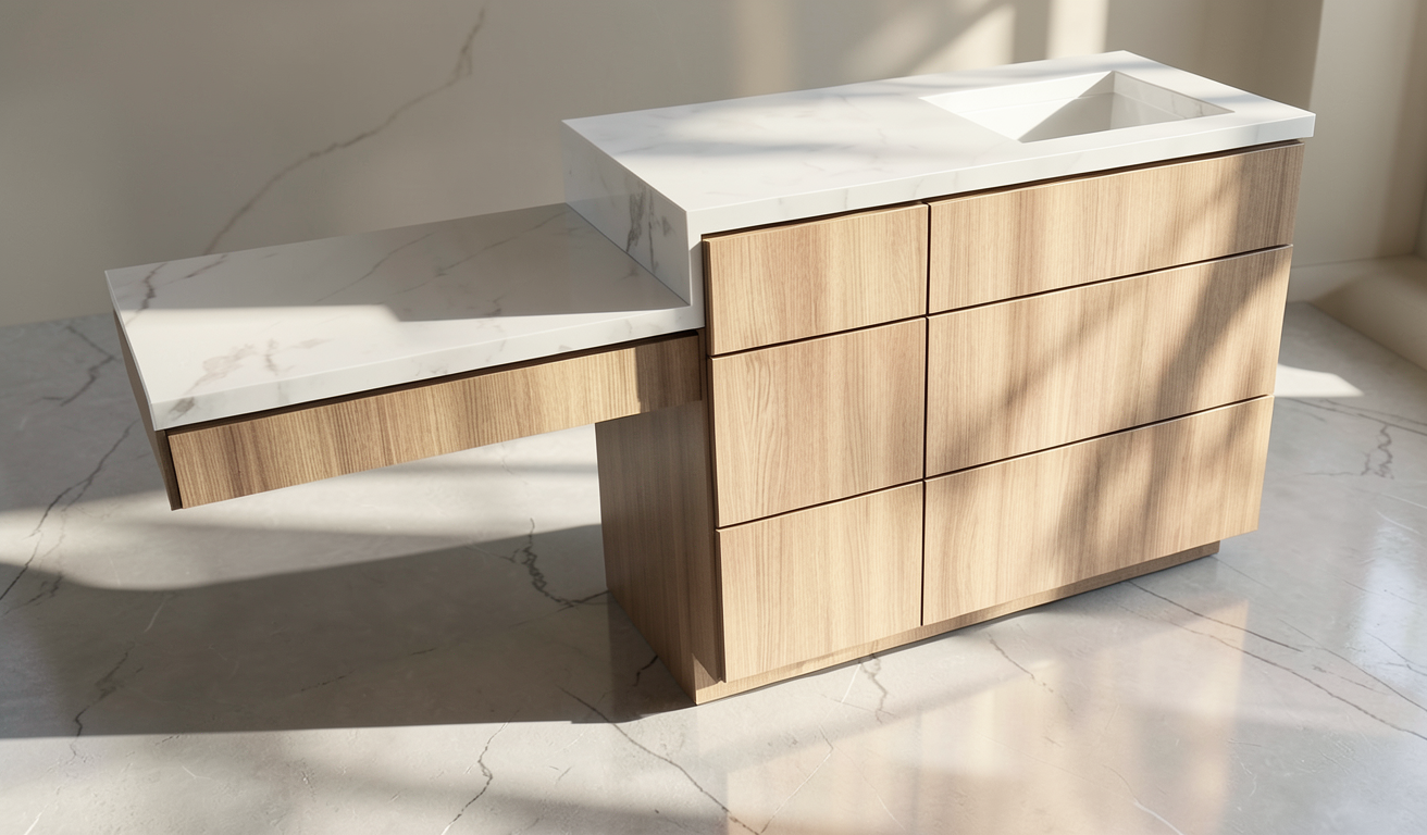 hyperrealistic architectural editorial photograph of a compact bathroom strictly preserving the exact composition camera position framing geometry and all original elements of the reference image absolutely no reinterpretation no additions no removals the mirror must remain exactly where it is with the same size and position the central vertical element is a mirror not a wall or panel extending from the vanity surface upwards it must remain fully present and clearly readable as a reflective surface the mirror reflects a floor to ceiling oak wood door with physically accurate perspective no distortion no exaggeration the reflection must feel natural and consistent with the camera position and scene geometry the oak door in the reflection has highly realistic materiality visible grain subtle tonal variation soft imperfections and a satin finish with controlled reflectivity never glossy the floor is large format beige porcelain tile rectified with extremely thin and nearly imperceptible joints matte finish and soft diffuse reflectivity slight tonal variation between tiles to avoid flatness the left wall and ceiling are finished in smooth white paint with very fine micro texture matte softly absorbing light without appearing flat or synthetic the right wall and the entire vanity structure front and top are clad in small format vertical ceramic tiles exactly matching the original layout tiles have subtle volumetric relief clearly defined but ally integrated joints and a matte finish that gently catches light on edges enhancing depth the sink is white porcelain with a smooth slightly satin surface soft reflections and realistic edge thickness no deformation or redesign the faucet and wall light aplique are brushed gold warm metallic tone subtle micro scratches and controlled soft reflections not mirror like the wicker baskets below the vanity are natural fiber with clearly defined woven texture slight irregularities and warm tonal variation they cast soft detailed micro shadows the glass vase is transparent with realistic thickness and refraction the flowers red lilies have delicate petal translucency subtle imperfections and natural gradients lighting is soft warm and diffused slightly directional enhancing volume and texture without harsh contrast the atmosphere should feel calm intimate and editorial with strong emphasis on material realism and depth ultra realistic rendering physically accurate materials soft global illumination no over sharpening no stylization