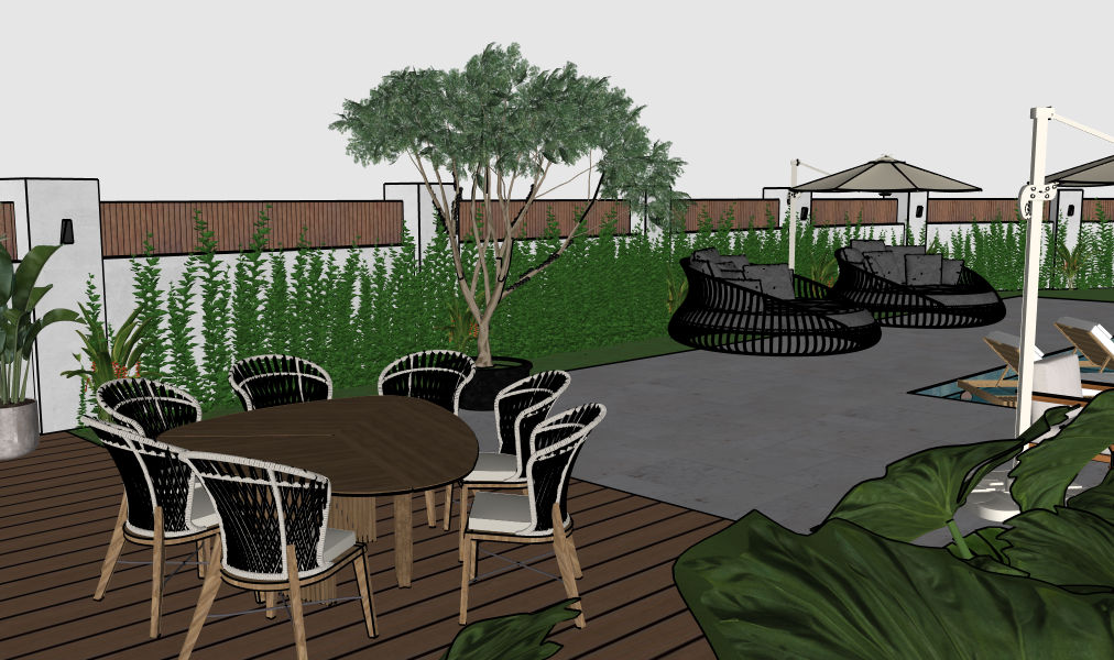 mantenha as texturas originais adicione paisagismo no fundo bem distante apos o muro de divisa com arvores grandes as arvores devem estar do outro lado do muro nao dentro do terreno principal a arvore do vaso no piso um pe de jaboticaba