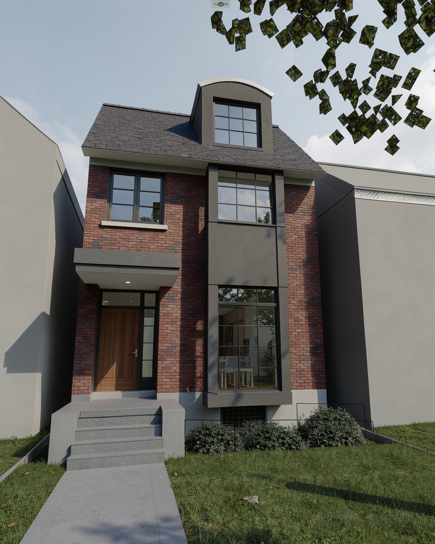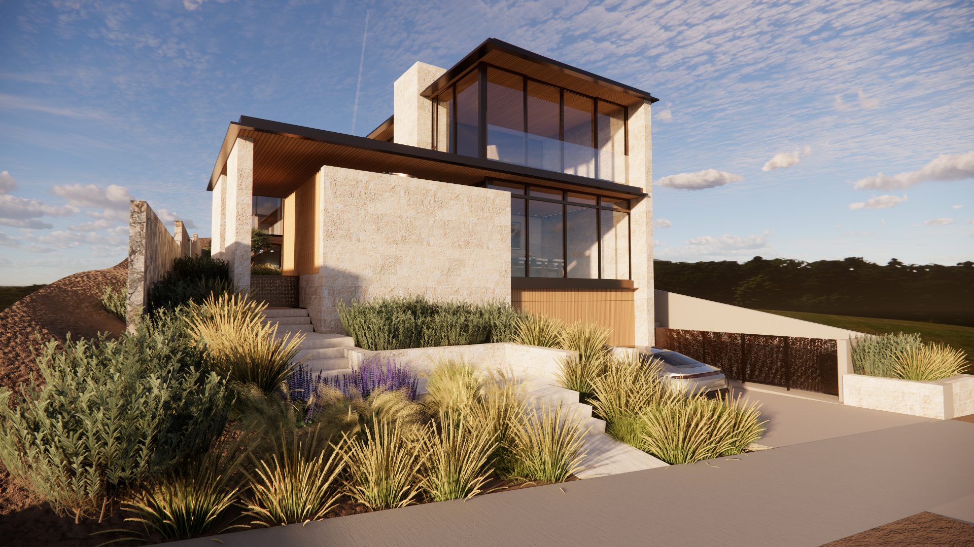 hyper realistic 3d rendering enhance texture on split face limestone walls soften planting and make more realistic do not change anything else enhance reflections and detailed textures