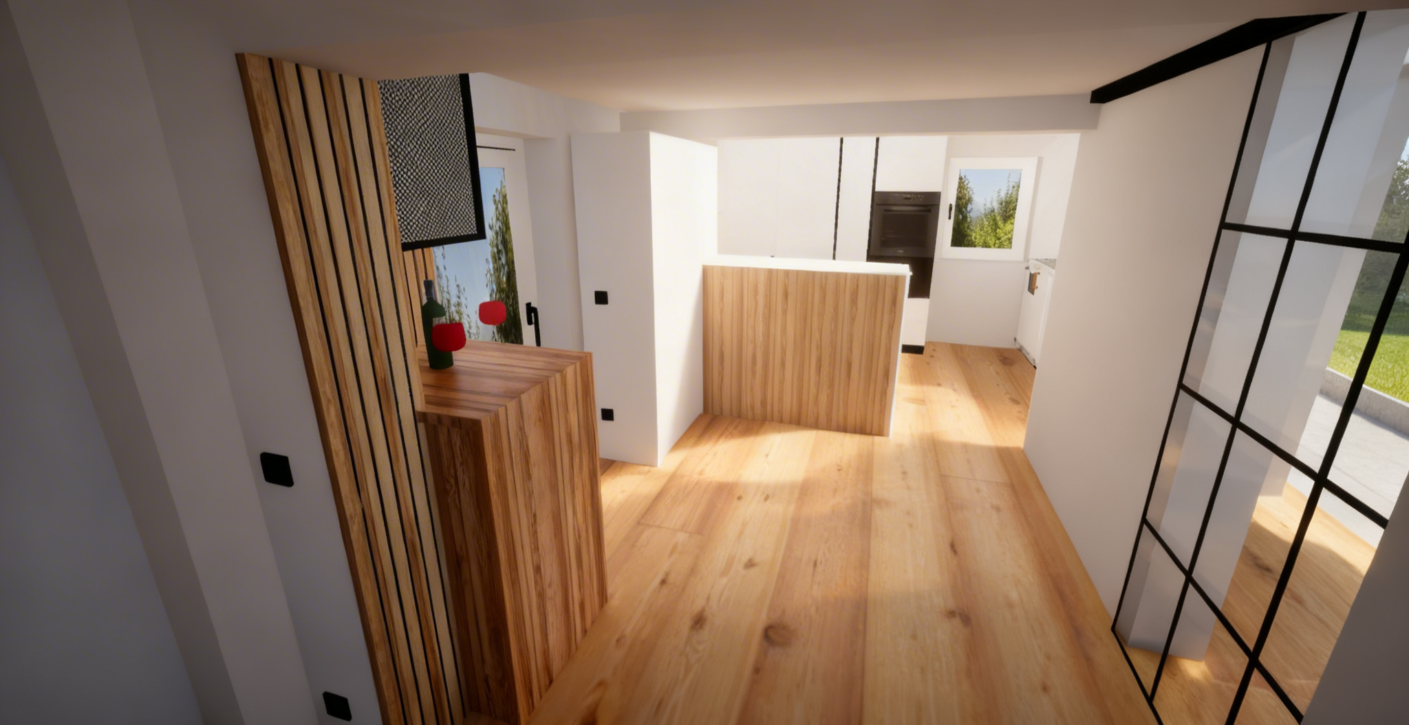 use the provided enscape render as the exact spatial and compositional reference do not change room geometry window placement or camera angle no background keep materials matte grey golden metal roof make it a summer day