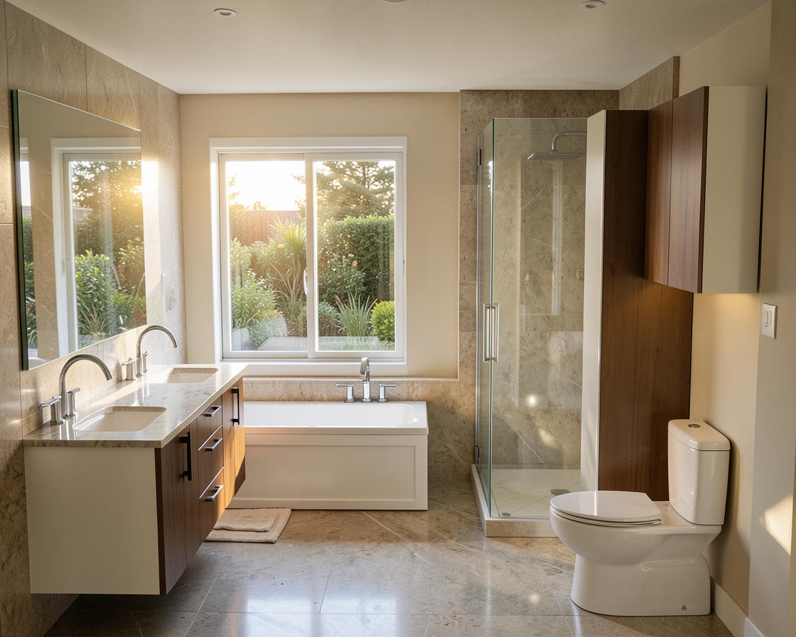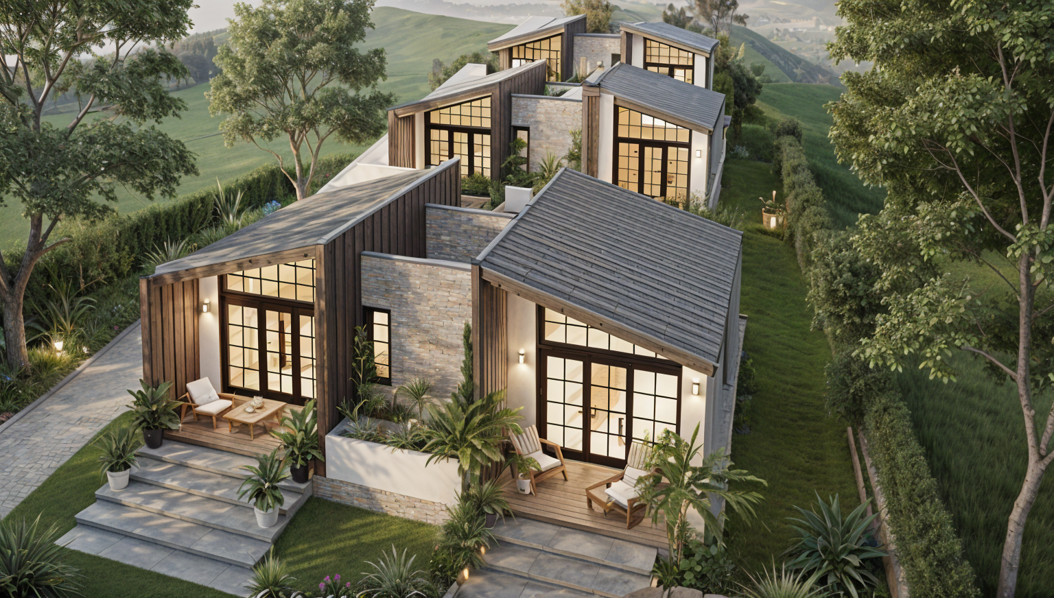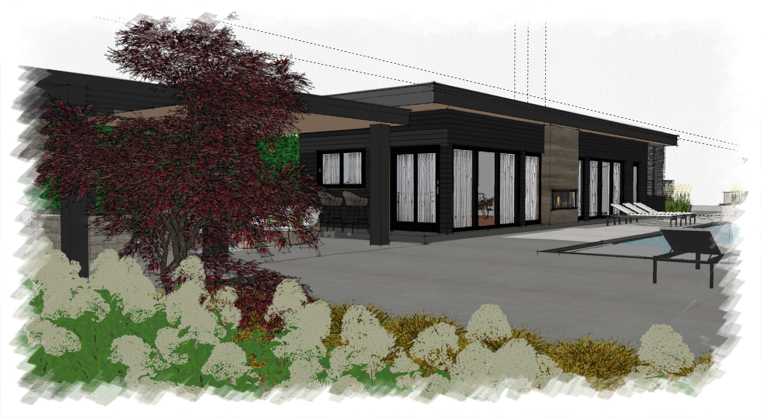 render a modern house with sleek minimalist architecture use a dark charcoal color for the building fa ade and pergola complemented by warm beige roof trims the windows should showcase sheer white curtains for a soft contrast feature a lush garden with deep burgundy foliage and vibrant green shrubs add pale creamy hydrangeas for a gentle brightness surround the scene with a tranquil atmosphere creating a peaceful and refined outdoor setting ensure the patio is smooth gray enhancing the modern aesthetic include a serene poolside with subtle blue water reflections and white lounge chairs for a touch of elegance capture the scene during the day with soft natural daylight for an inviting and luxurious ambiance