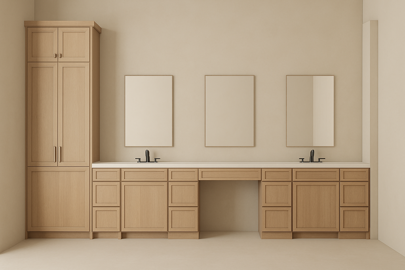 modern interior shot render a minimalist bathroom in a soft warm atmosphere featuring a wall mounted white ceramic sink with a sleek modern silver faucet surrounding walls are painted in a calming light beige exuding warmth grey half tile walls add a narrow window allowing gentle natural light to spill over the space on the left incorporate open shelves with a light oak finish for natural texture and warmth the flooring is a smooth light gray tile adding subtle contrast ensure soft shadows for a cozy and inviting ambiance architecture