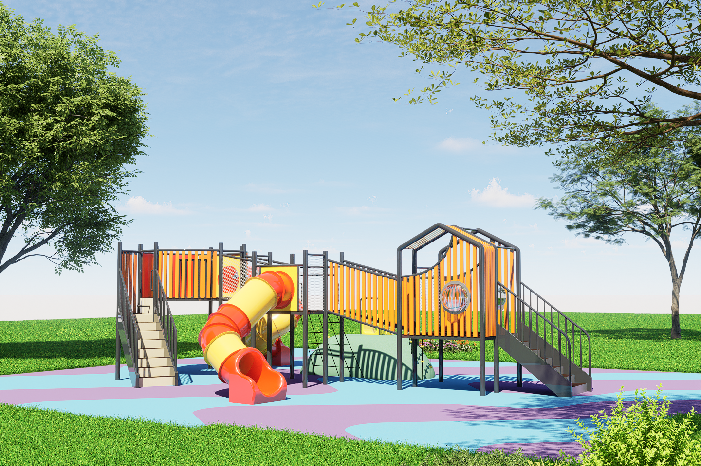 do not change the original playground layout or angles do not change the colour of playground epdm the setting should remain clearly outdoors surrounded by lush well maintained landscaping including mature trees layered shrubs and green buffer zones for privacy and comfort shrubs and hedges should form a boundary separating the playground from adjacent areas the ground treatment around the playground should consist of well kept grass and appropriate outdoor safety surfacing blending naturally into the surrounding lawn and landscape the left and right sides should show residential condominiums add realism