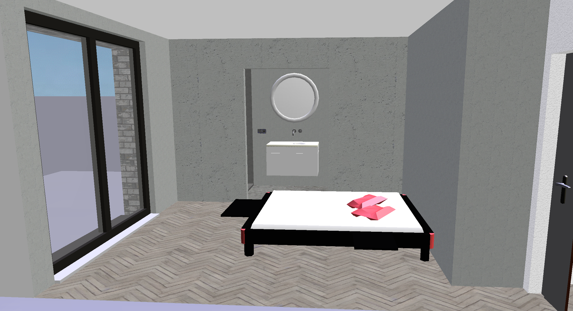 genau dieses rendering berarbeiten fotorealistisches innenraum foto exakt dieselbe perspektive und kameraposition wie das hochgeladene referenzbild 100 identische raumgeometrie exakt gleiche m belanordnung exakt gleiche verlegeart und richtung von parket und platten wie vorlage parket ruhig und hellgrau weiches nat rliches tageslicht raum k nstlich ausleuchten sanfte realistische schatten realistische materialien stoff mit leichten gebrauchsspuren hochwertige oberfl chenreflexionen lavabo komplett aus marmor collemandina grigio in braungrau dunkel lavabo innen ebenfalls collemandina im unterbau im obersten drittel eine griffmulde ber die ganze breite ganzer unterbau in collemandina unterbaum bel mit unterbaubeleuchtung dahinter eine gessi wandarmatur edelstahl vollkommen rahmenloser und hinterleuchteter spiegel mit echten spiegelungen alle sichtbaren w nde sind sichtbeton schwarze steckdose und schalter links vom lavabo auf gleicher h he wie die armaturen schwarze runde deckenspots im bad und im zimmer bett wie vorlage modern mit kopfteil aus beigem abgestepptem stoffbezug mittig im raum bettdecke und kissen wie im hotel frau um 40 auf dem bett am lesen kleiner schminktisch beim fenster bild an der wand auf der rechten seite parket im zimmer ruhig und hellgrau boden im badbereich collemandina grigio in braungrau fassade aussen aus hellgrauem klinker sehr moderner minimalistischer look nat rliche farbwiedergabe golden hour feeling hell ausleuchten das bild muss wie eine professionelle fotografie aussehen es soll ein echtes und reales foto sein canon eos r5 35 mm festbrennweite f 2 8 hyperrealistisch dslr qualit t raw aufnahme 8k aufl sung extrem scharf perfekte tiefensch rfe professionelle architekturfotografie