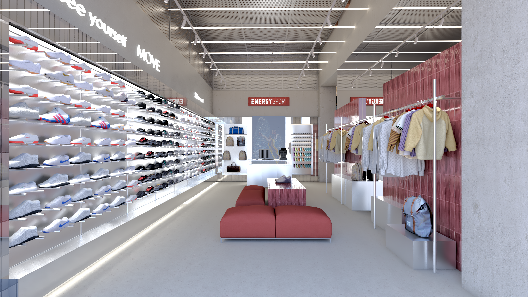 hyper reslistic interior of a sports shop with metal finishes light concrete floor and elements with small red tiles
