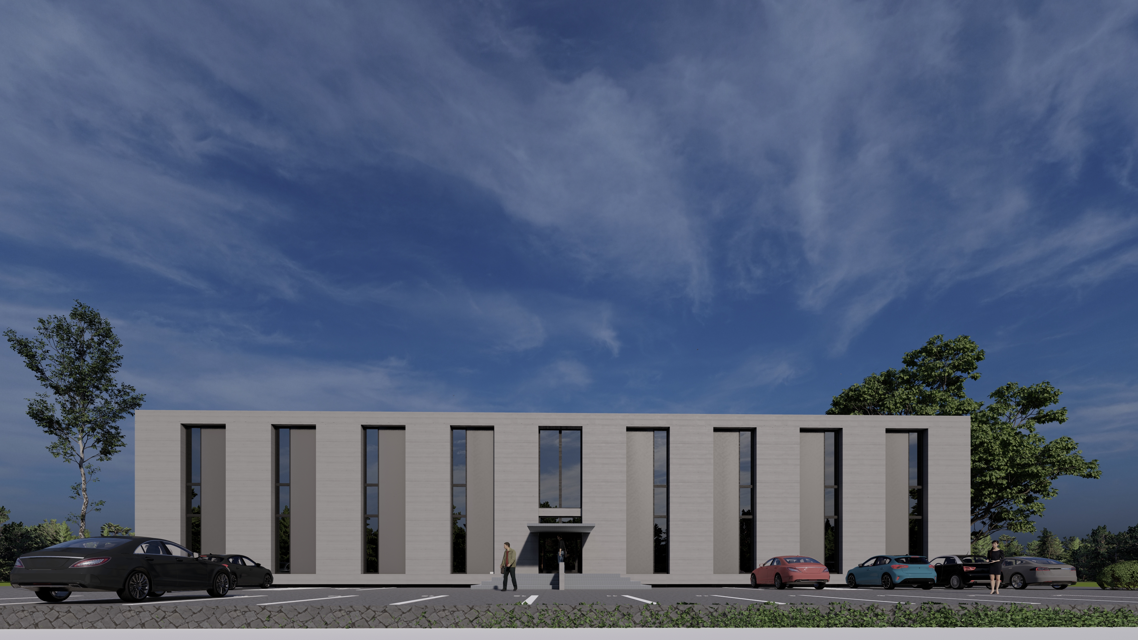 minimalism exterior shot company headquarters with parking in front people walking vegetation architecture