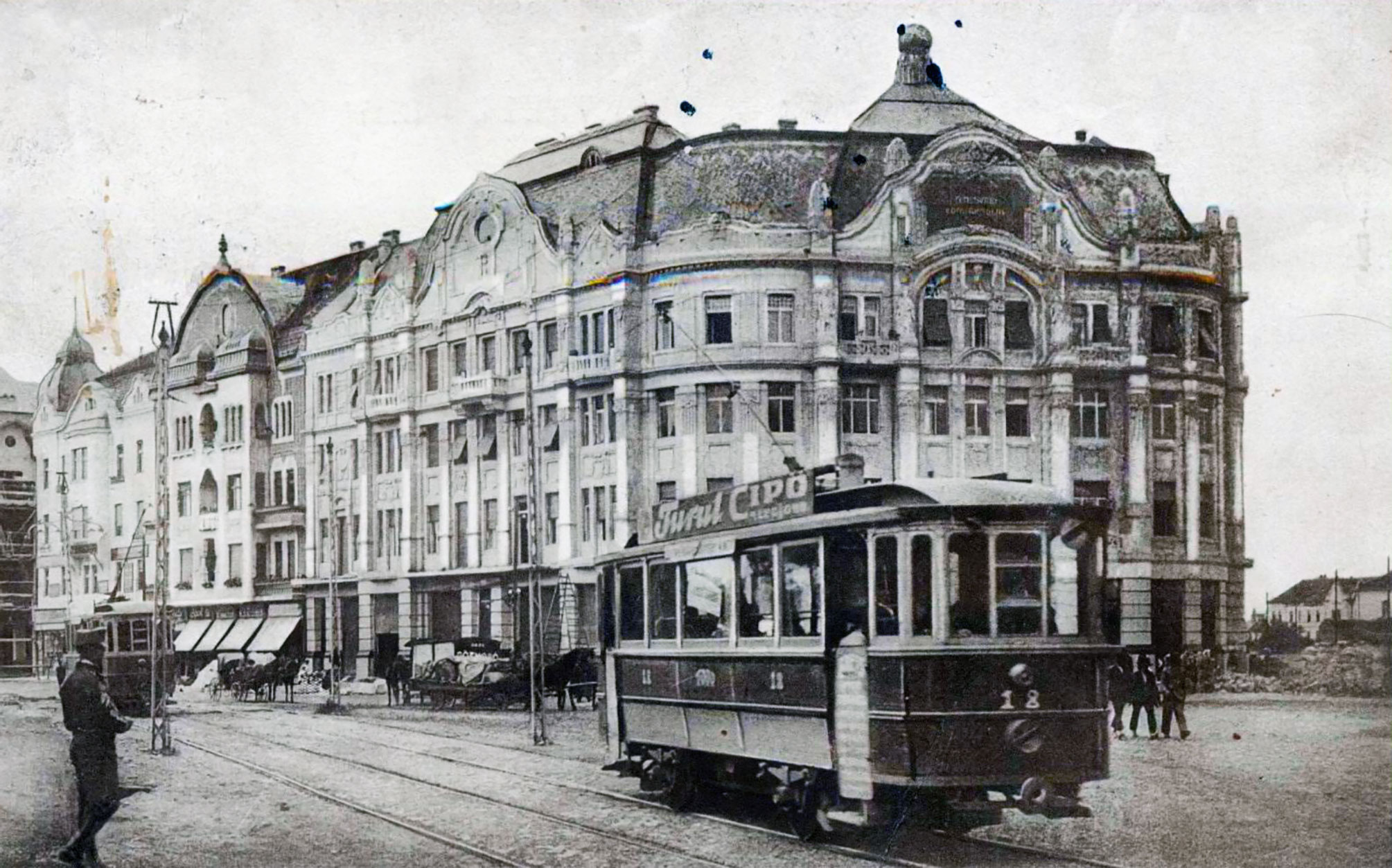 sunny day beautyful clouds stucco fassade white ocre light orange black tram