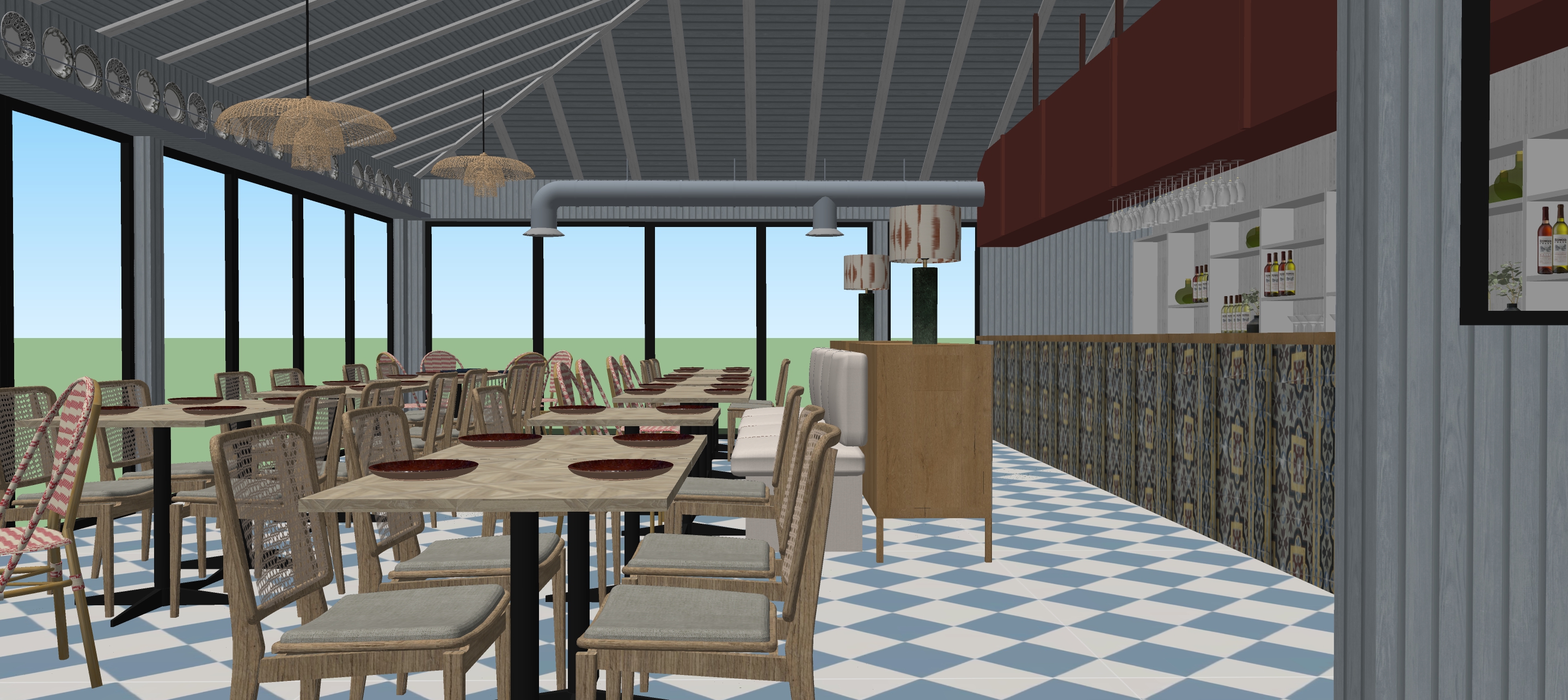 interior shot render a cozy inviting restaurant interior with modern rustic charm use soft warm lighting to create a relaxed atmosphere design a ceiling with exposed wood beams in a muted gray the floor features elegant blue and white checkered tiles use light natural wood for the tables and chairs with woven rattan backrests and cannage the chairs have alternating red and white striped cushions for added pop the countertop is wooden with colorful intricate patterned tiles in blue yellow and dark red the back wall bar shelves are white housing various colored bottles and green vases hanging pendant lights emit a warm ambient glow complemented by the expansive windows showing a clear blue sky surrounded by nature and trees architecture