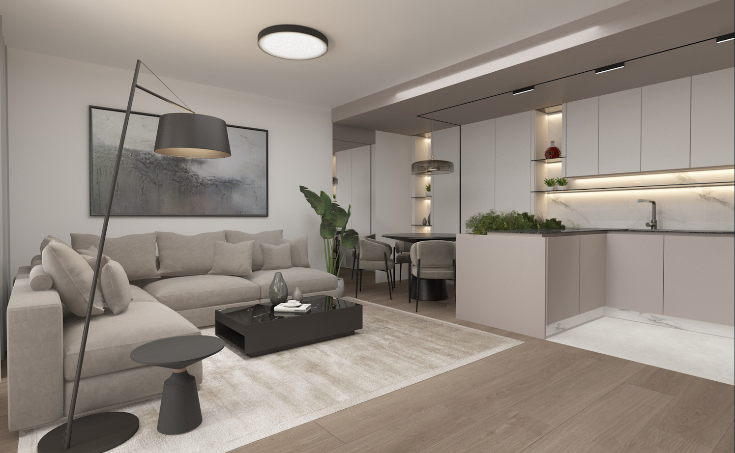 luxurious modern living room with a neutral color palette a large cozy grey beige sectional sofa with plush cushions is the focal point a sleek black marble coffee table sits in front of it accompanied by a minimalist black floor lamp the walls are adorned with abstract art in gray tones soft natural light filters through sheer white curtains casting gentle shadows the kitchen area features elegant beige cabinetry with soft ambient lighting lush green plants add a touch of nature creating a peaceful atmosphere the room exudes warmth and sophistication with its harmonious blend of soft beiges subtle grays and rich blacks