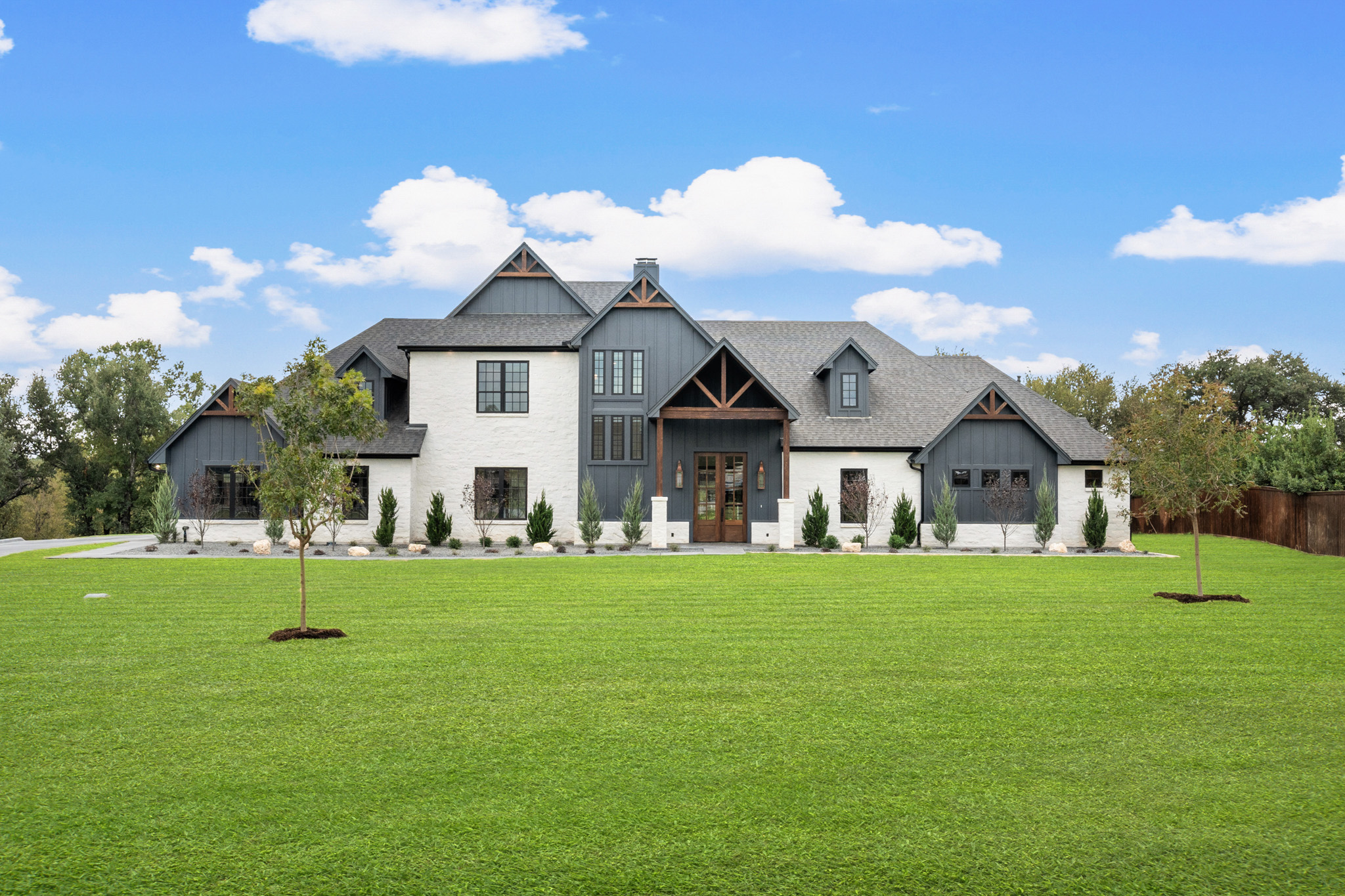 large trees behind the house at sunset