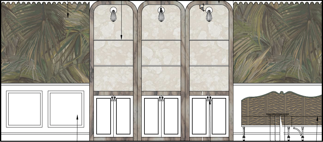 a moody dining room wall featuring a marble and antiqued glas built in with dark blue slate floors olive green high gloss wainscoting brown cabinet doors with off white pencil trim brass sconces and palm wallpaper on a sunny day
