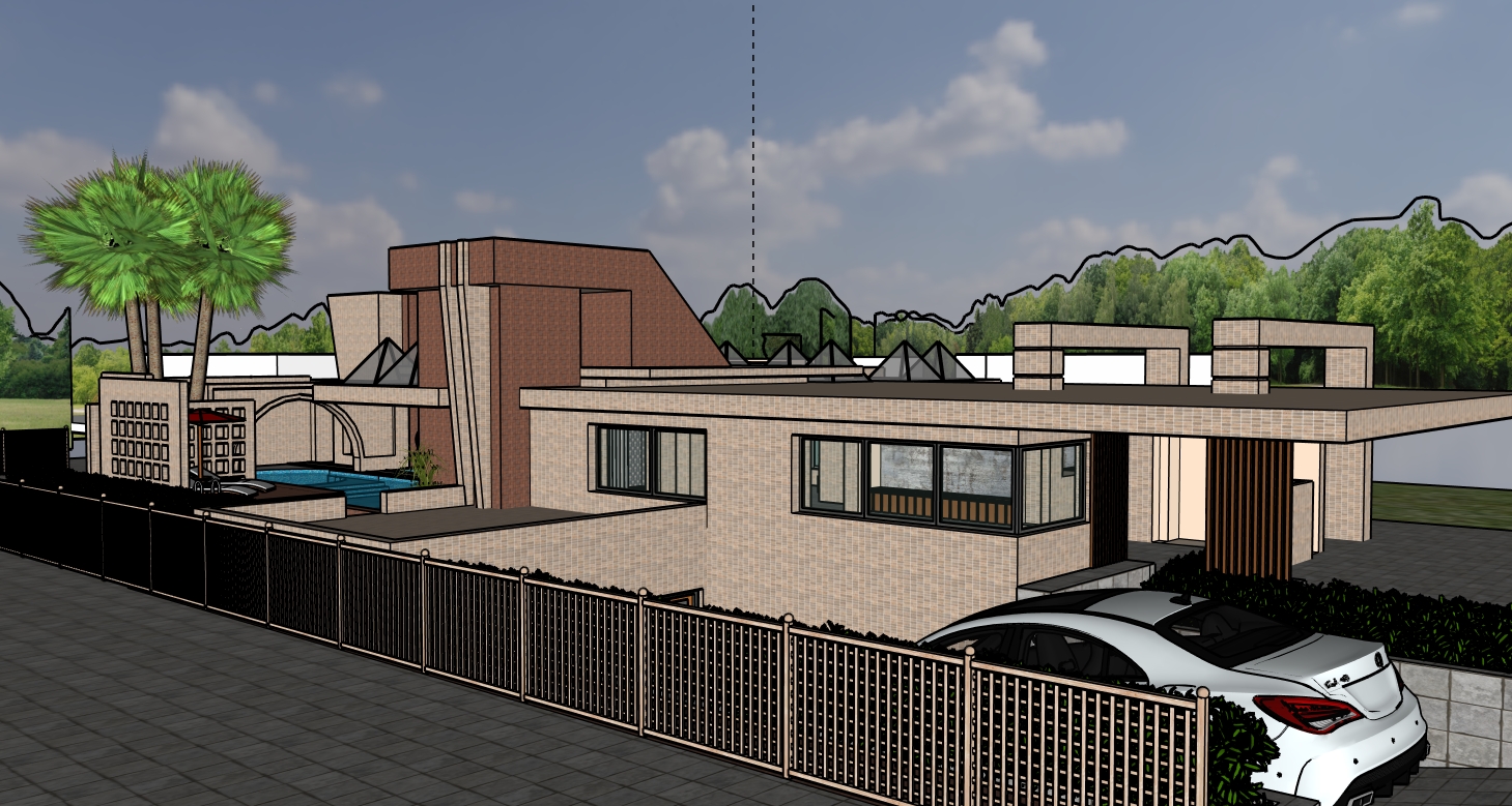 make a real render with real water in pool area show the furniture inside the house and show more houses around my design