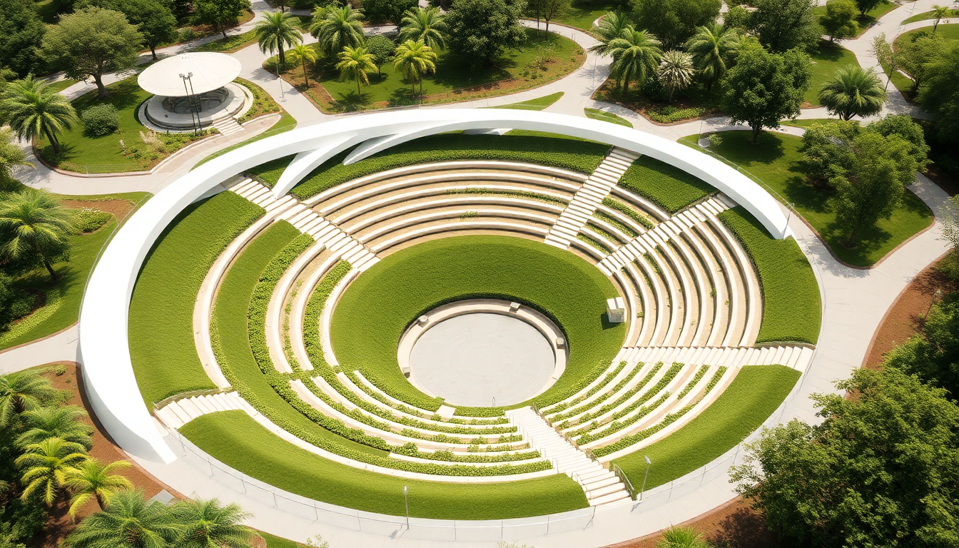 eye level view of a sunken circular amphitheater carved into a green landscape mound with smooth concentric stepped seating two low gently rising ribbon like metal arches emerge from the berm and lean diagonally inward toward the amphitheater the arches curve softly and cross each other near the center at a shallow angle never rising high above the horizon they appear like sculptural metal arms lifting from the earth not tall structural spans the arches stay close to the ground and follow the slope functioning as artistic walkway elements and shading gestures clean minimal background accurate to the provided elevation