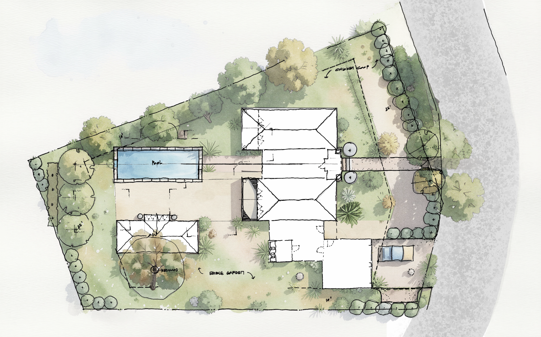 the white area can you add roofing material keep hand sketch look should have some rough shading indication of light
