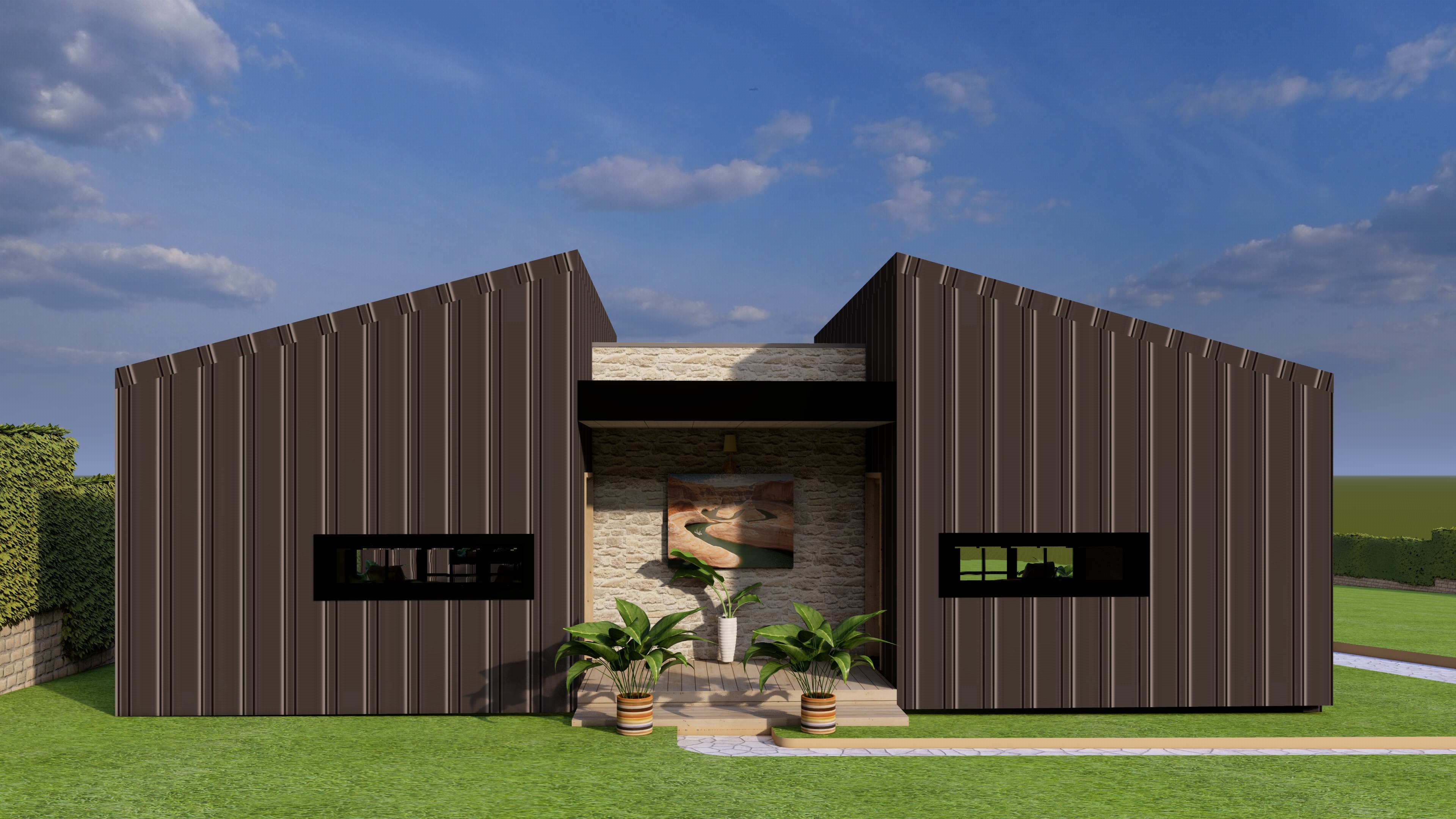 add few trees in background and vegetation for context add creamish interior warm lighting low brightness