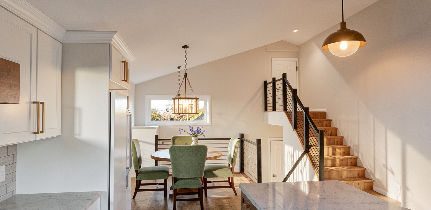 transform this image into a warm contemporary adaptive reuse atrium while preserving the exact section perspective geometry cut plane and proportions of the original drawing maintain all cut elements exactly where they occur and render cut materials accurately show clt wall panels with clear vertical grain at the cut plane exposed brick with crisp cut texture and concrete floor slabs with realistic aggregate at the cut for elements beyond the cut plane render full materiality with photorealistic detail replace interior wall surfaces with exposed brick and large 8 x10 clt panels do not add any additonal stairs and make the large wall solid with no openings and preserve the historic windows on the brick wall convert all floors to smooth lightly polished concrete do not alter redesign or replace the stair geometry keep the existing stair shape dimensions and layout exactly as drawn preserve the historic trim located under the first set of steel crossing beams exactly as drawn do not remove modify or reinterpret it render the historic trim clean crisp and white maintaining its original profile and proportions maintain all steel beams and connections rendering them with slightly weathered steel texture introduce soft diffuse natural daylight from above and adjacent glazing to match a modern adaptive reuse atrium enhance depth contrast and material realism while keeping all architectural lines structural relationships and section cuts unchanged