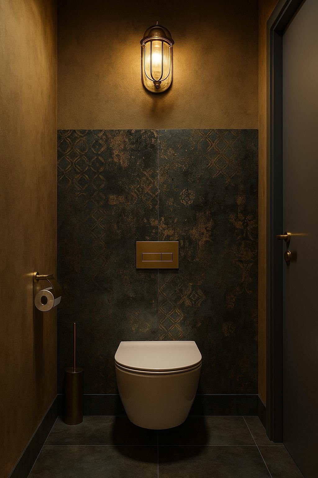 keep the same camera angle proportions and layout do not change or move any elements use the same floor tiles as in the rest of the wc behind the washbasin use the same wall tiles as shown in the reference image change the wall color to a lighter warm neutral tone not yellow soft and natural to match the marble and tiles add a rustic hanging chandelier above the washbasin area for a cozy mediterranean touch change the toilet wc bowl to a dark grey color with a matte or satin finish keep everything else identical and high quality with realistic materials and warm lighting