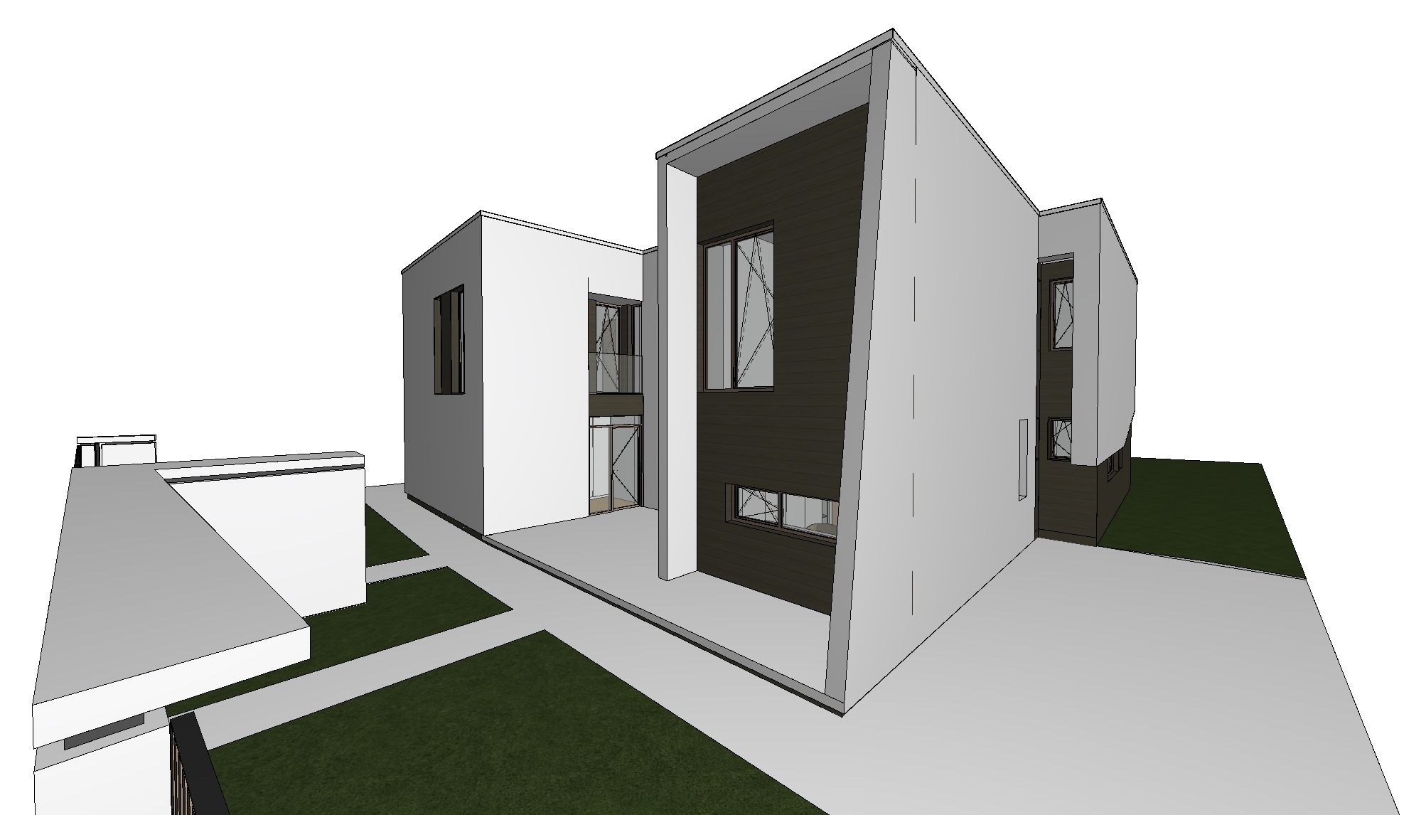 render this modern residential building exactly as modeled it is extremely important to strictly preserve the original architecture geometry proportions and all design elements do not modify simplify or reinterpret anything windows keep all existing windows exactly as they are in the original model do not remove resize reposition or simplify any windows lighting use soft diffuse daylight overcast sky no harsh shadows or strong contrast calm evenly distributed natural light materials and textures all white surfaces must remain simple clean matte white plaster no added texture no noise no patterns all brown areas must be replaced with horizontal wooden slats ribbed cladding the wooden slats must be thinner and more closely spaced narrow profile light oak color brighter natural tone not dark matte finish no gloss or reflections subtle realistic wood texture not exaggerated window frames and doors must be wood matching the same light oak tone and matte finish ground and environment ground surface should be simple and minimal light neutral surface no heavy texture grass must look natural and slightly wild not perfectly trimmed or artificial add decorative plants and ornamental grasses in a natural arrangement background add trees in the background but make sure they do not cover or obstruct the architecture trees should frame the scene subtly and enhance realism without dominating the image style photorealistic architectural visualization clean minimal contemporary look high attention to material realism without exaggeration preserve the architectural identity 100