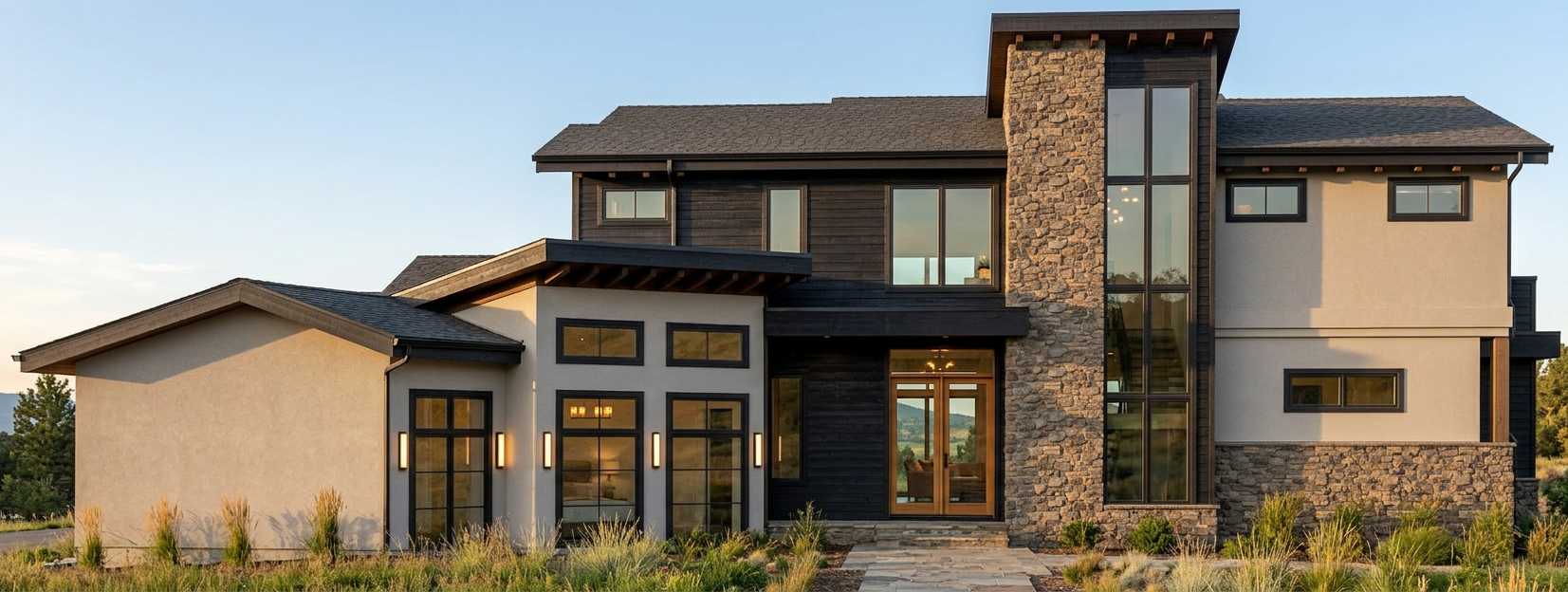 a manicured lawn layered flower beds low maintenance shrubs native plants stone pathway leading to the entrance with mountains in the distance