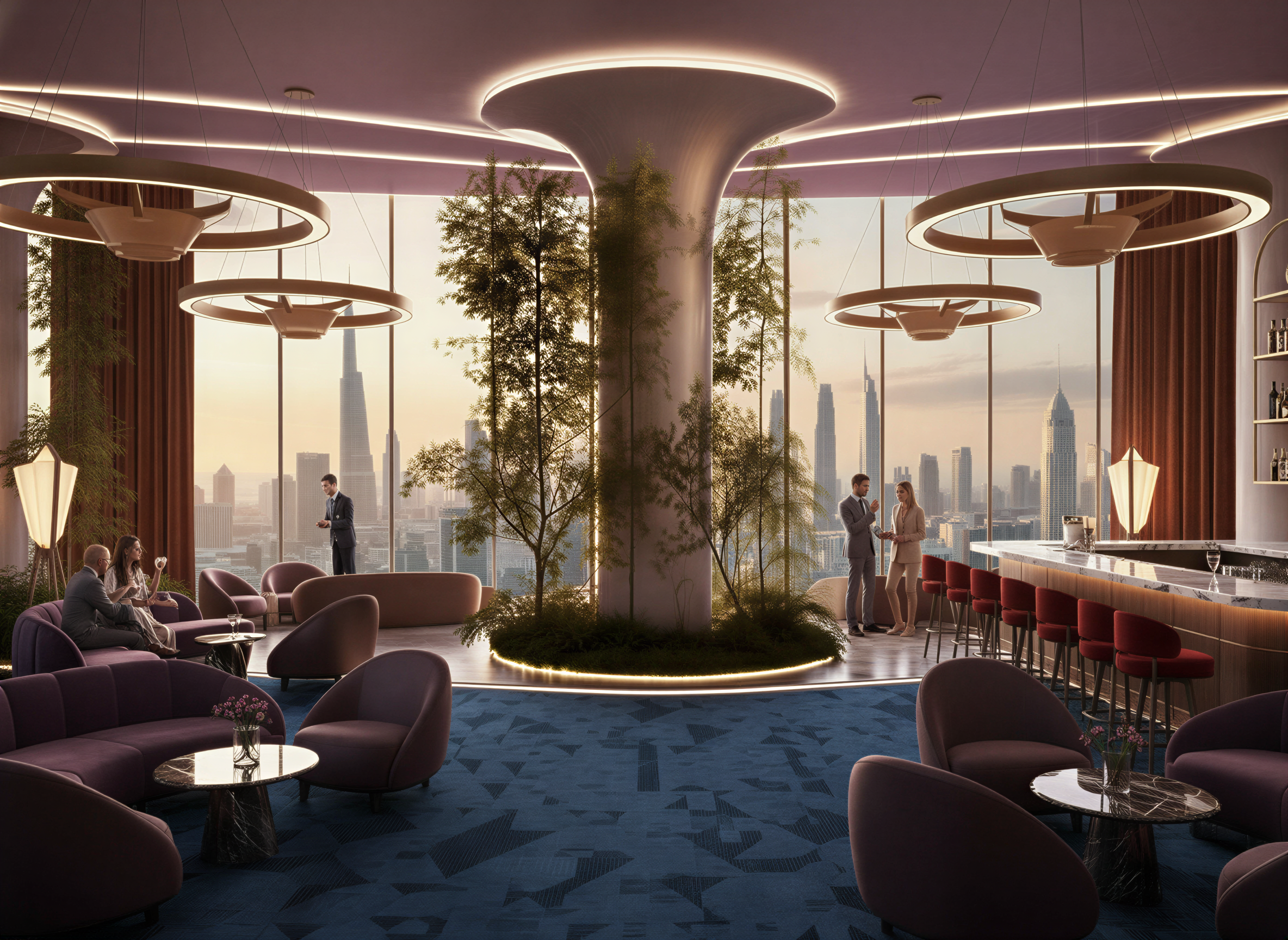luxurious futuristic sky lounge belonging to an elite arts club likea negroni lounge with cool sculptures
