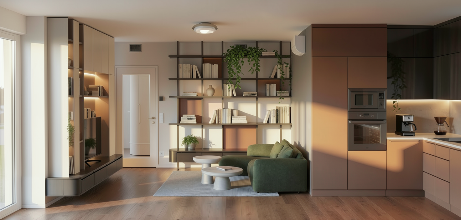 realistic view calm the bed is dressed with perfectly ironed impeccably arranged bedding and pillows styled like a five star hotel the sheets and duvet are crisp smooth and completely wrinkle free small base legs on the bed white sliding wardrope on the left