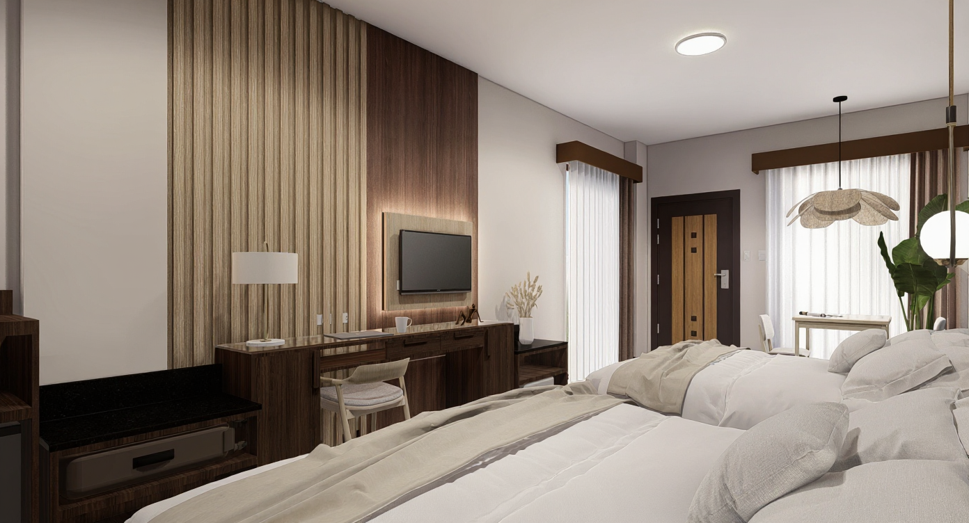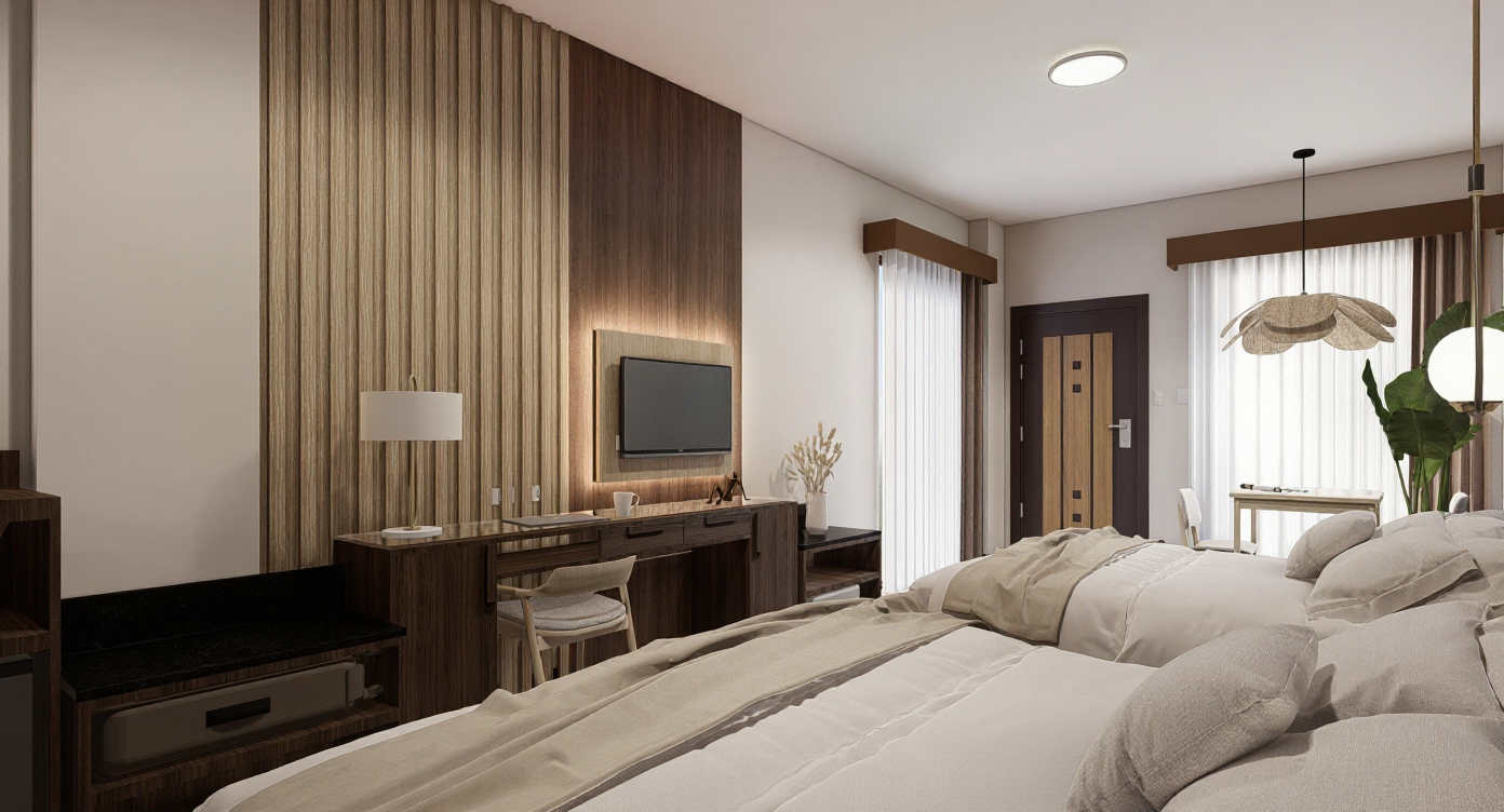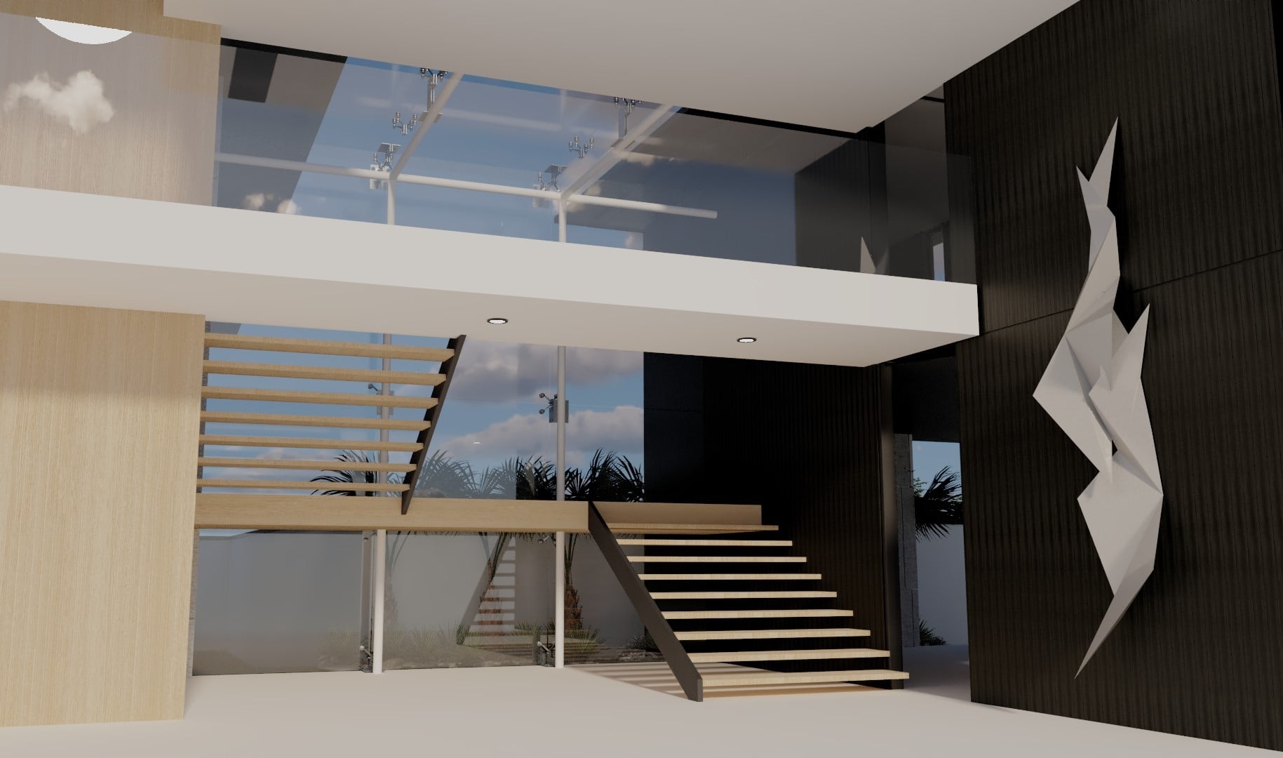 modern interior design elegant and minimalist staircase sleek wooden steps with light oak finish black metal railings white walls large glass windows with a view of a vibrant blue sky and fluffy white clouds abstract geometric sculpture on dark textured wall bright natural lighting plants in the background atmosphere serene and contemporary colors light oak white black blue and green