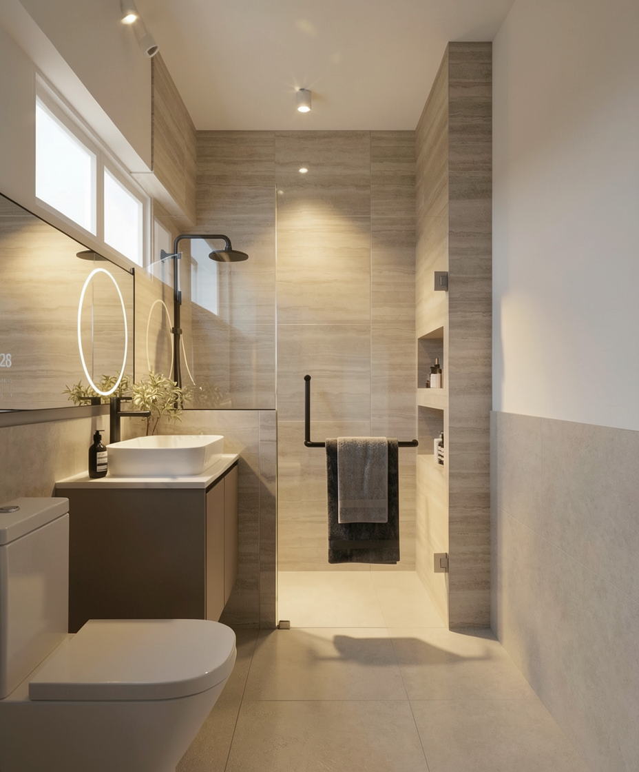 preserve original geometry keep layout unchanged no redesign no new furniture enhance only lighting and materials follow the drawing exactly preserve all wall positions and room proportions exactly no modification to design and materials do not change any materials or colors change black bathroom accessories into chrome beige color for the sink cabinet remove 2 spotlight above sink