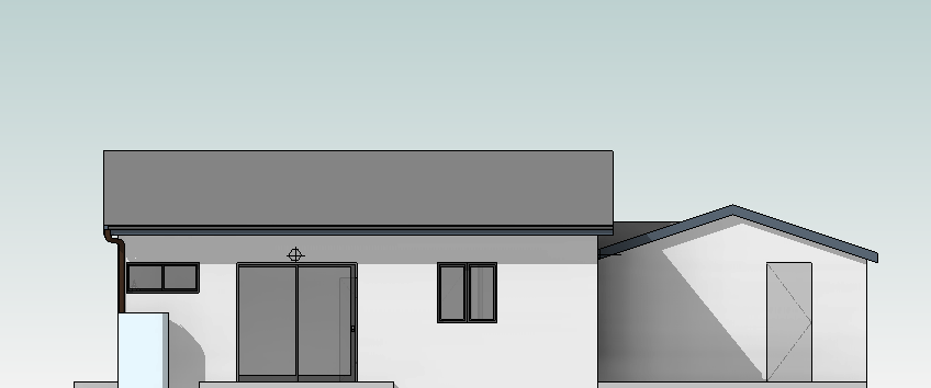 modernist exterior shot vertical wood slats white stucco dark gray roof schematic artistic trees and sky on backgrouns architecture