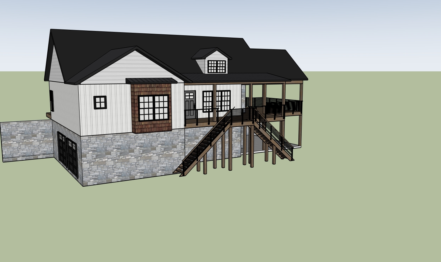 home sits in appalachian mountains with mature trees on the left side concrete driveway enters on the bottom level left side with two garage doors not facing the front stone foundation retaining wall cable railings small mountain view on right with mature evergreen trees mature landscaping on left front
