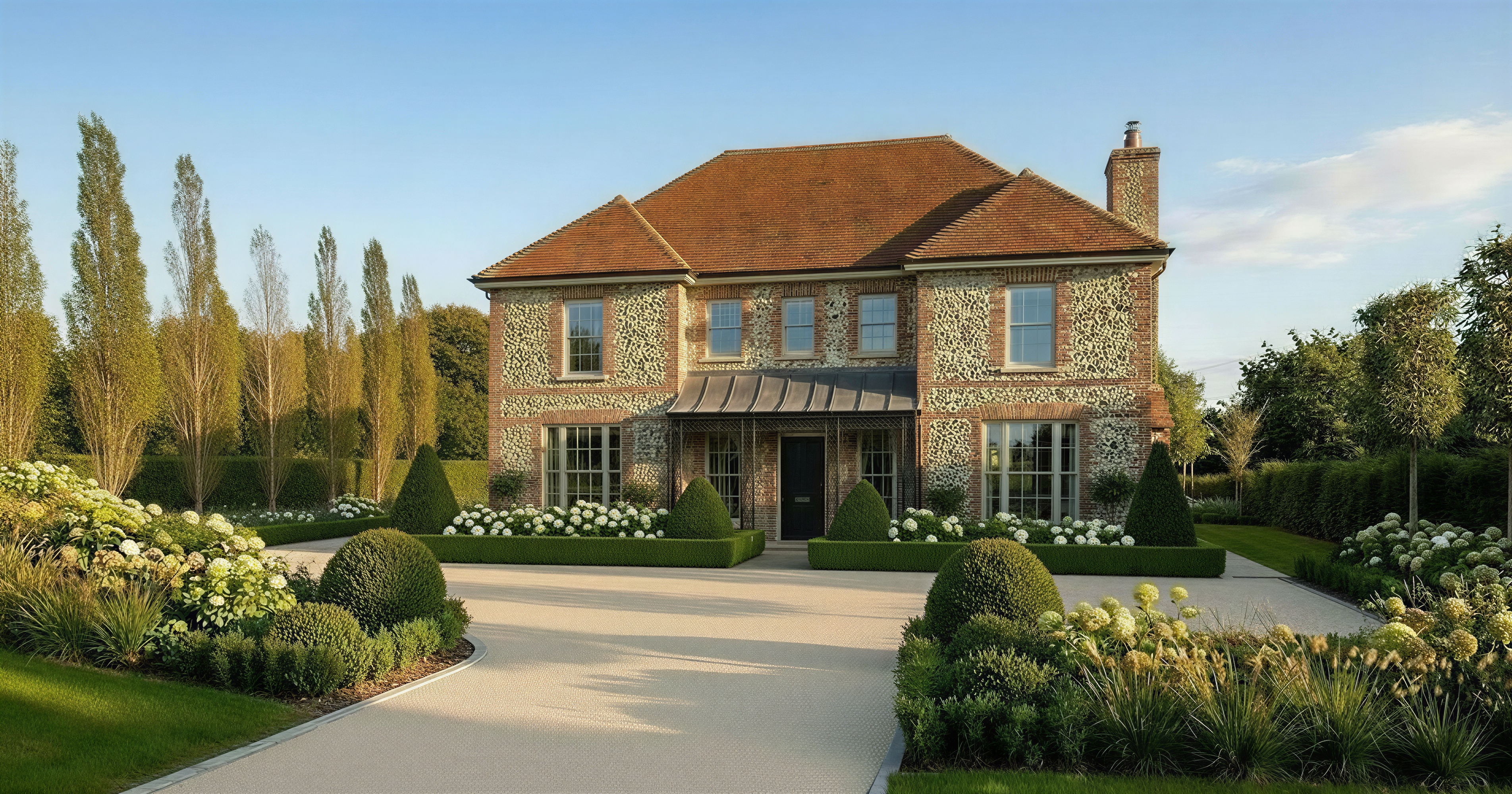 use this image but change the flint and brick to portland stone change the roof to grey slate with a stone portico and remove the lead roof in place of a classical entrance to the front door