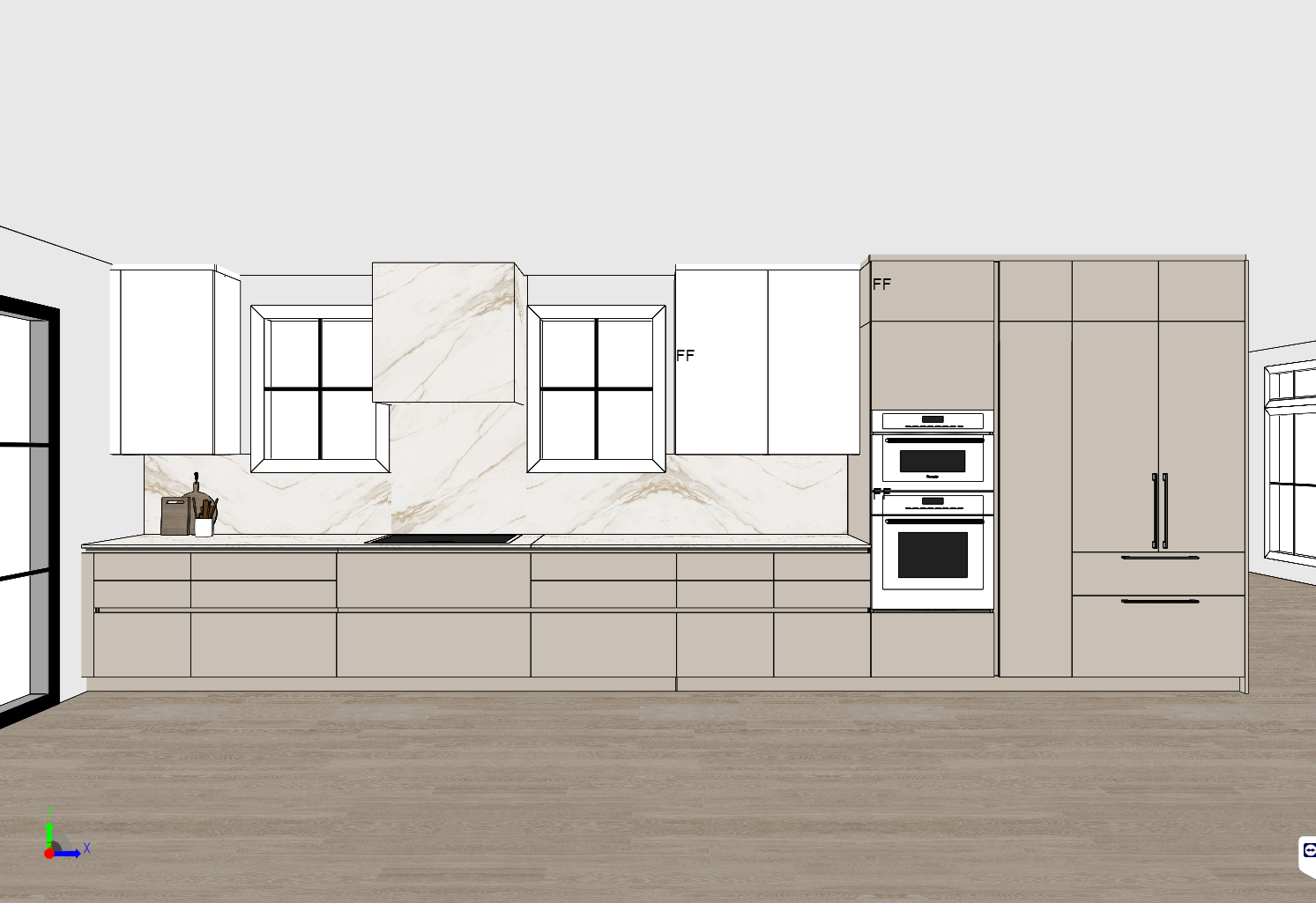 interior architectural visualization of a scavolini kitchen poetica collection lower cabinets and tall units in matte pearl effect glass pas dos upper wall cabinets in matte glass prestige white channels in matching pas dos finish countertop and matching backsplash in polished neolith calacatta roma professional integrated thermador stainless steel ovens 36 gaggenau induction cooktop vertical 18 inch brushed nickel handles on integrated refrigerator panels only black minimalist window frames with crisp white architectural trim flooring in light oak planks soft morning sunlight diffused reflections on matte glass surfaces photorealistic 8k