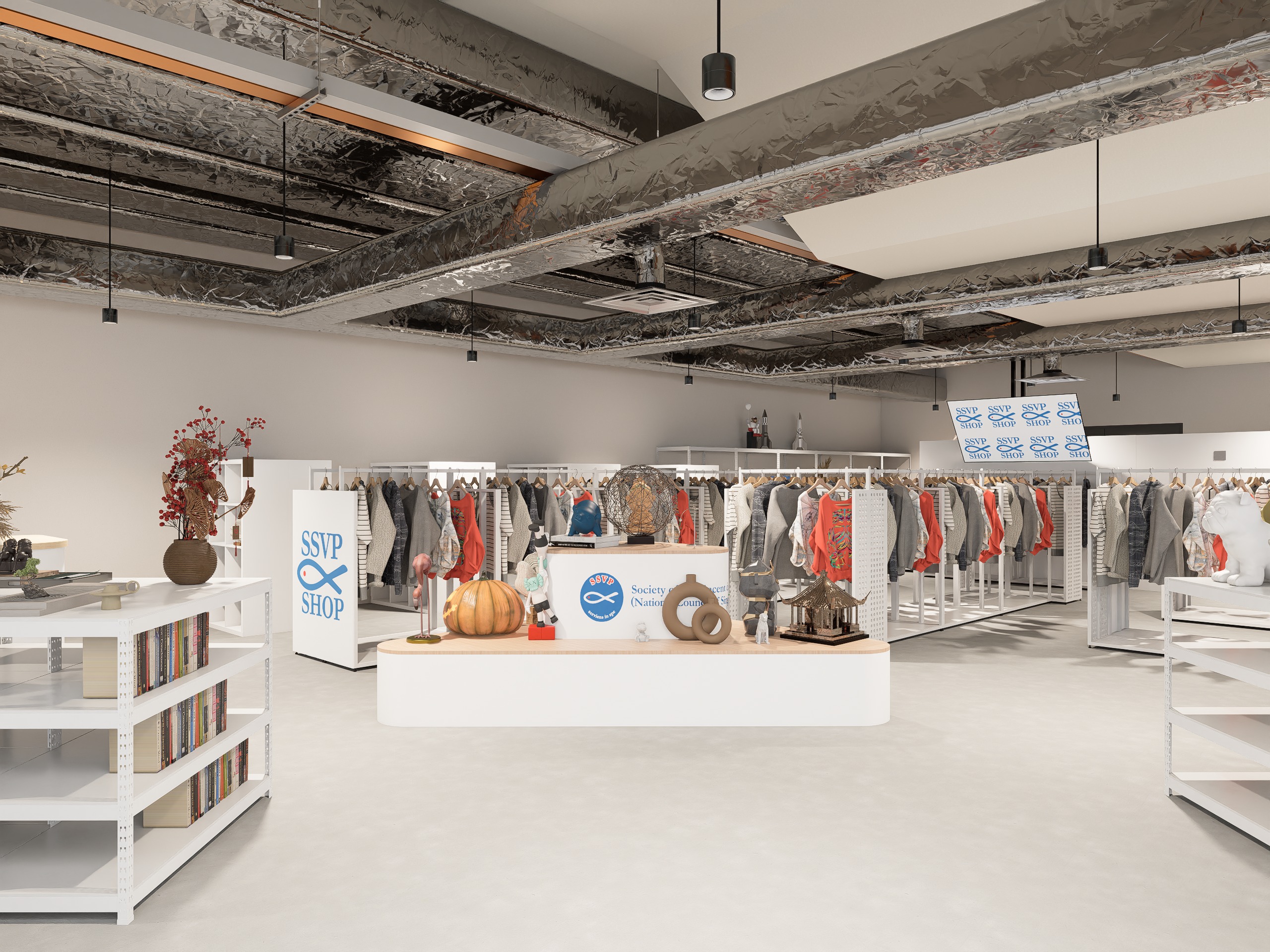 interior shot fill the empty shelves with objects typically found in thrift shop and houseware stores only add items do not touch existing items architecture