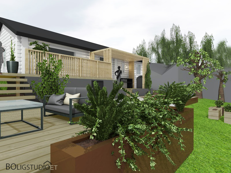 generate a realistic image of a modern house exterior with a minimalist design the house features sleek white walls with black window frames and trims in the foreground a red leaved tree with dynamic falling leaves stands against the backdrop of a bright blue sky and radiant sun creating a warm and inviting atmosphere the gray stone pathway leads to the entrance flanked by well manicured green grass on both sides modern outdoor stairs in dark gray lead up to the house with subtle garden lights enhancing the welcoming ambiance include contemporary outdoor furniture on a wooden deck in the background to complete the serene setting