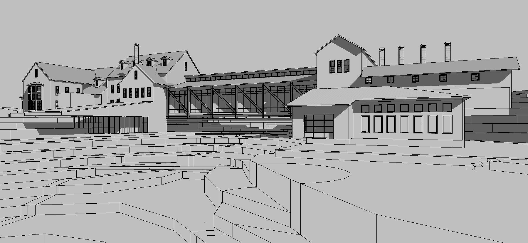 industrial design stone farmhouse set into the hillside vertical shiplap mill house metal bridge with small stream under buildings in hillside with tall grass fog trees in background metal smoke stacks
