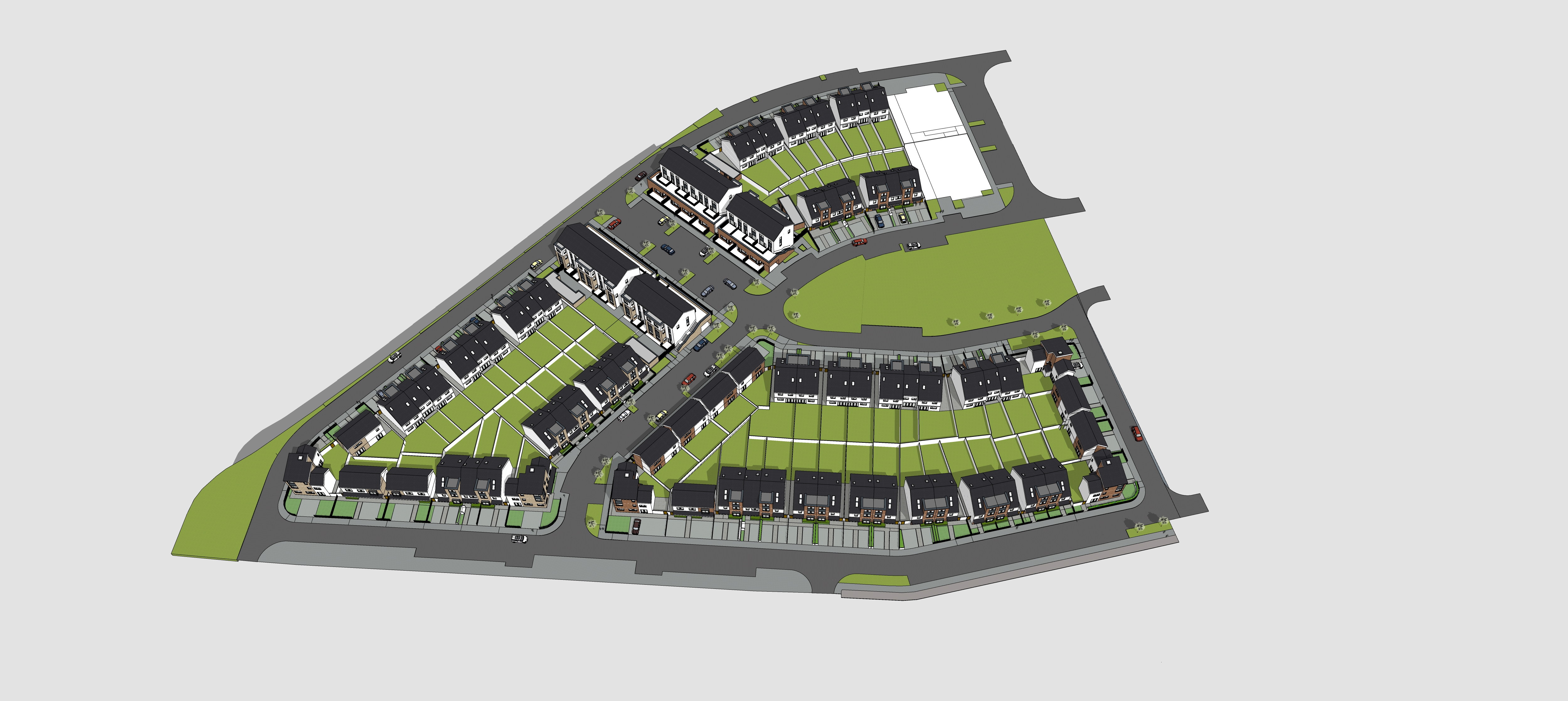 render a suburban neighborhood with a bird s eye view showcasing a modern residential layout use lush green for lawns cool gray for roads and pathways and crisp white for the buildings walls with dark charcoal roofs highlight trees with vibrant green foliage scattered throughout include warm brown for shading and detailing on building facades capture a serene and welcoming atmosphere with soft daylight illuminating the scene