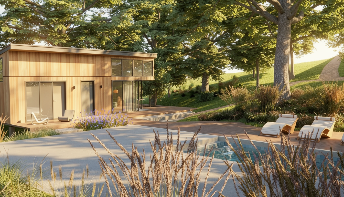 custom backyard pool prompt tailored to your image use the provided image as the base rendering preserve everything exactly as is house architecture patio structure fencing trees camera angle lighting direction do not modify or move the home or hardscape pool placement critical for realism design a rectangular in ground pool positioned directly behind the covered patio centered on the rear fa ade layout rules start the pool approximately 8 10 feet off the patio edge align the pool parallel to the house keep equal spacing on both sides relative to the yard and fence pool should occupy the central lawn area only do not push into fence lines suggested proportions length 28 34 ft width 12 16 ft this keeps it luxury but believable for the lot size pool design clean rectangular pool with sharp modern edges light plaster or pebble interior soft ivory light gray thin waterline tile subtle not flashy integrated baja shelf on the shallow end closest to patio 2 in water loungers on the tanning ledge optional flush spa integrated at one end right side preferred no oversized or resort style curves keep it architectural and tight decking hardscape replace grass immediately around pool with large format limestone or travertine pavers extend decking from patio to pool around perimeter minimum 3 4 ft walking space create a clean rectangular hardscape zone that visually anchors the pool landscape design keep it structured and upscale add low boxwood hedges along fence line for structure add ornamental trees 2 3 max placed asymmetrically layer with soft grasses for movement keep lawn areas clean and intentional don t overfill important maintain sightlines to the house don t overcrowd this is quiet luxury not a botanical garden outdoor living zones enhance don t clutter add 2 4 chaise loungers along one long side of the pool optional small fire feature or seating cluster opposite side keep the existing covered patio as the main dining lounge zone lighting golden hour or soft daylight add subtle pool glow uplighting on trees low path lights all lighting should feel warm 3000k and architectural style direction quiet luxury outdoor environment minimal clean geometry high end materials no excessive features think river oaks highland park buckhead custom home rendering quality ultra photorealistic 35mm lens realistic water reflections natural shadows slight imperfections for realism final instruction most important the pool and landscape must feel proportionally correct to this exact yard buildable in real life consistent with a 2m 5m custom home