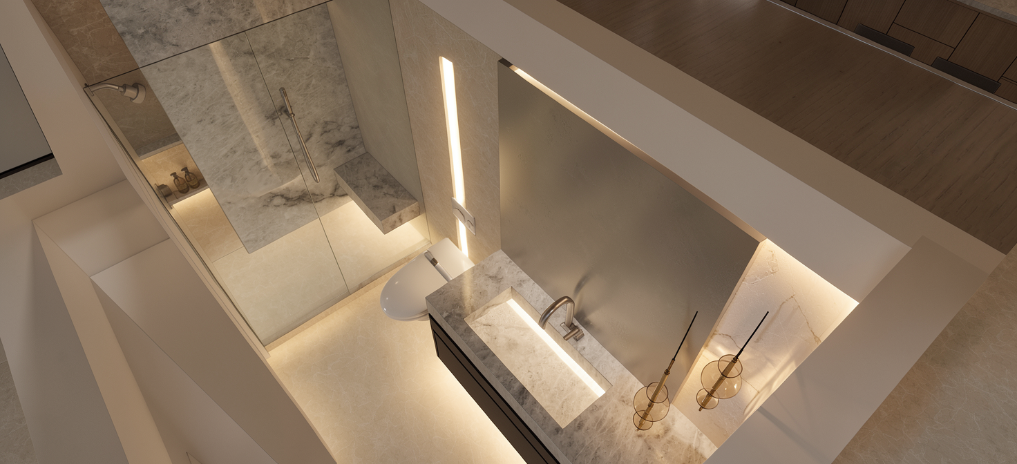 starting from the current displayed rendering exactly as it is do not modify any architecture staircase furniture lighting flooring ceiling focus only on the vertical recessed niche on the back wall where the framed panels currently hang remove the framed panels and leave the recessed back wall surface otherwise unchanged in the recessed vertical niche insert a refined hainan huanghuali wood panel that extends continuously from the top to the bottom of the niche without interruption carve the li brocade pattern into this huanghuali wood panel in a seamless continuous relief that covers the full height and width of the niche make the carved pattern visible with gentle light and shadow contrast adjust the central wood tone of the huanghuali to be less saturated and closer in warmth to the adjacent wall wood and brise soleil avoiding overly rich coloration in the center do not modify the central wall behind the staircase or any other surface only modify this vertical recessed niche to be a tall continuous carved panel with balanced wood saturation