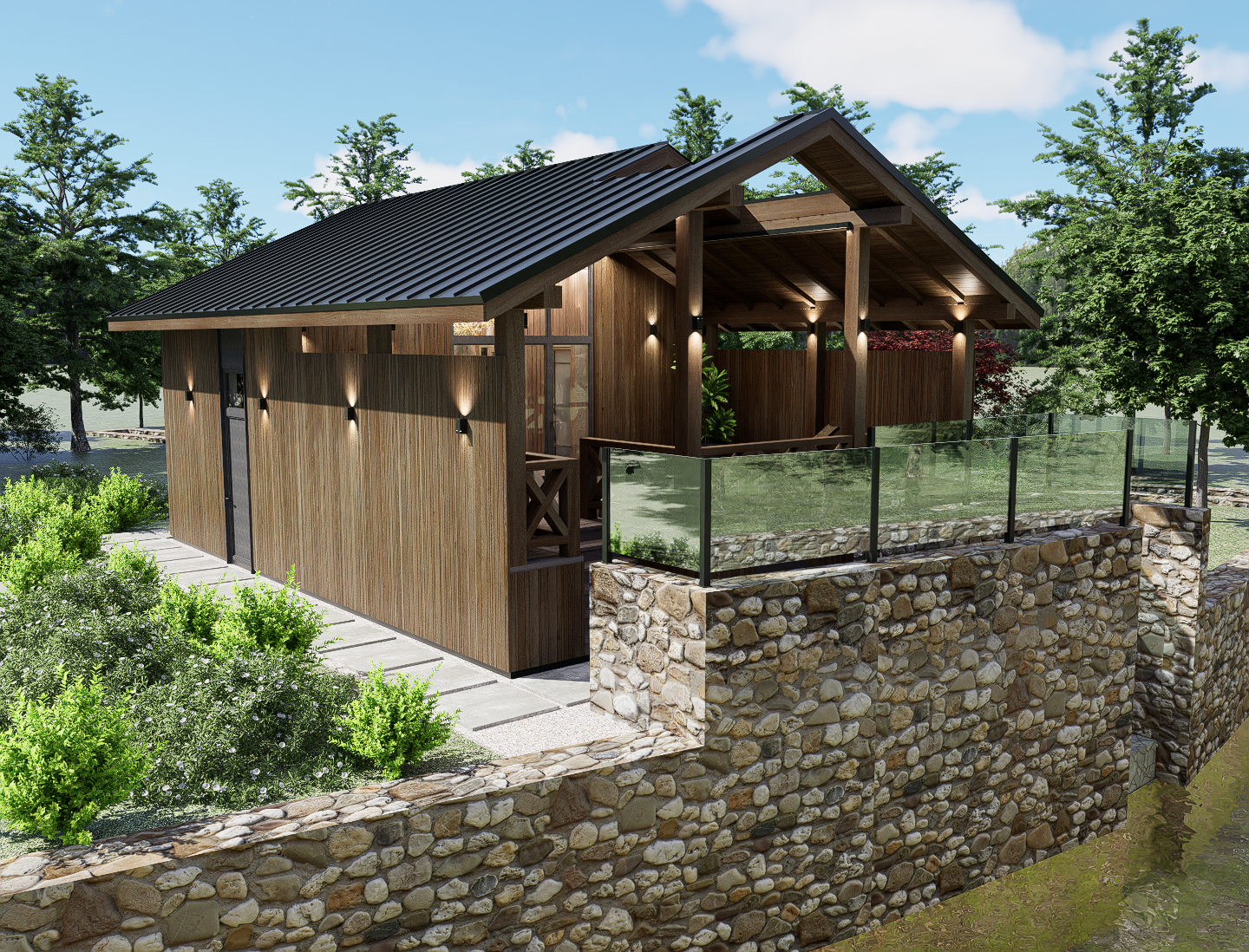 create a photorealistic 3d perspective of this house using the current material style but enhancing it use a graphite metal roof with a standing seam and vertical wood siding keep the model s geometry unchanged windows doors roof walls sidewalk and driveway don t change the view just enhance the existing materials and enhance the landscape detailed textures in the wood siding and reflections in the glass as well as a bright clear sky with subtle atmospheric depth render in hyperrealistic architectural visualization quality resolution