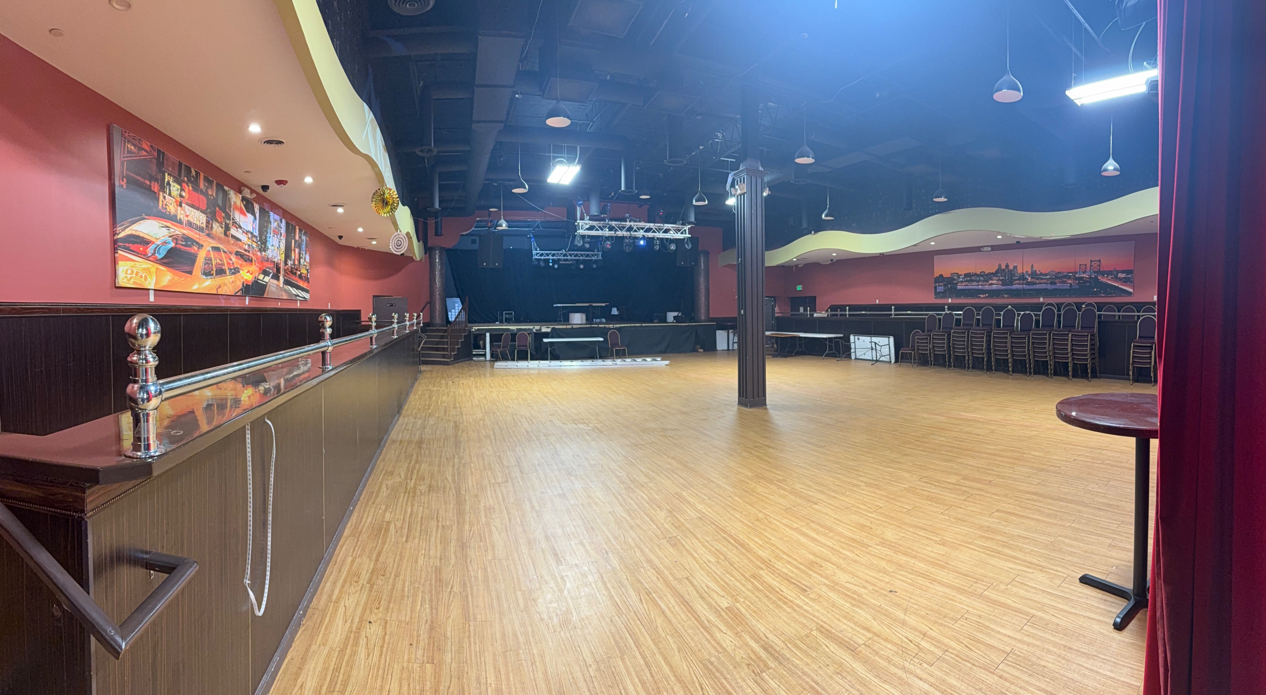 replace the stage with duckpin bowling add four topgolf swing suites with lounge chairs and a round side table in each bay two suites on the left and right sides of the room add high top tables and bar stools in the middle of the room
