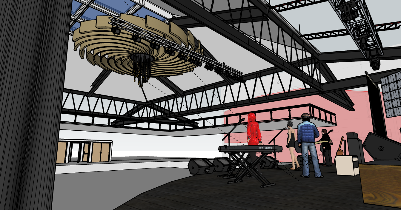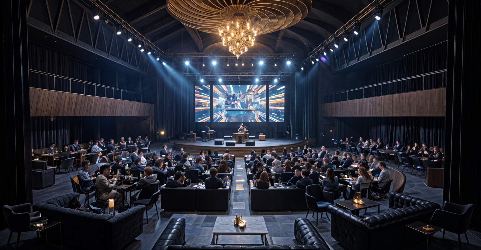 sarineen wide angle shot the camera is inside the room at floor level in the performance area facing the audience seating the stage is behind the camera and not visible a modern nightclub interior unfolds outward from this vantage the sunken audience area is directly in front of the camera the perimeter walkways and lounge seating platforms are higher the room has exposed steel trusses a sculptural ceiling element overhead and a chandelier of tungsten edison bulbs hanging from the center of that ceiling feature the audience occupies dense round and 4 top lounge seating with tufted leather velvet upholstery brushed metal accents and dark wood tables patrons face toward the camera s position watching the unseen performers behind it no one looks away there is a single led wall located behind the camera not visible from this angle no screens appear anywhere in the visible space concert lighting beams and subtle haze originate from unseen truss fixtures coloring the room warm chandelier light blends with stage spill the floor is polished concrete with soft reflections the mood is upscale modern and active at nig architecture