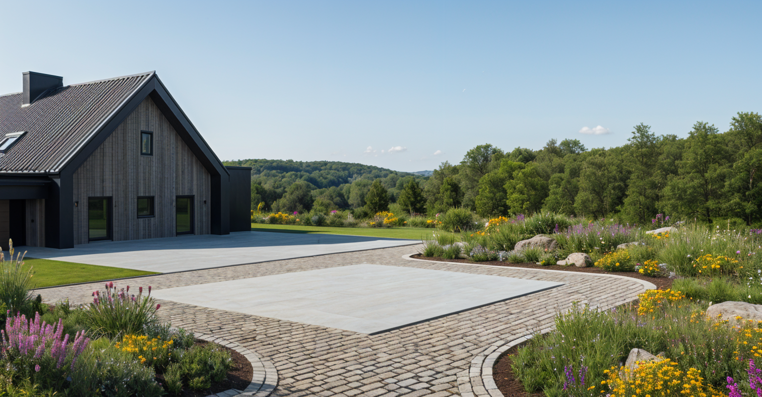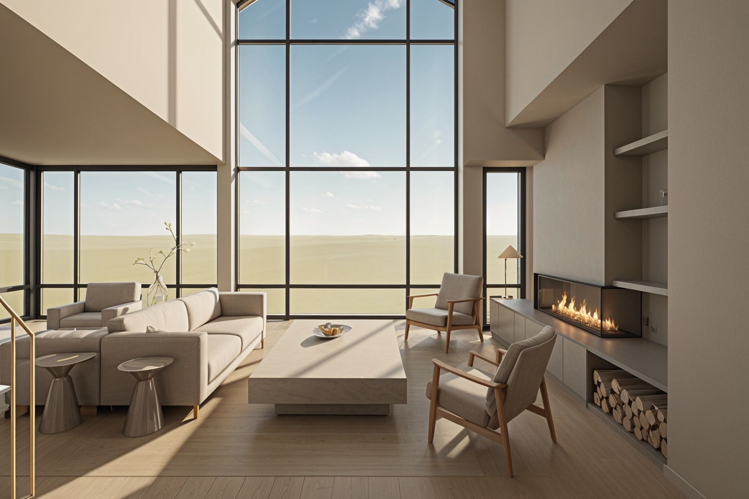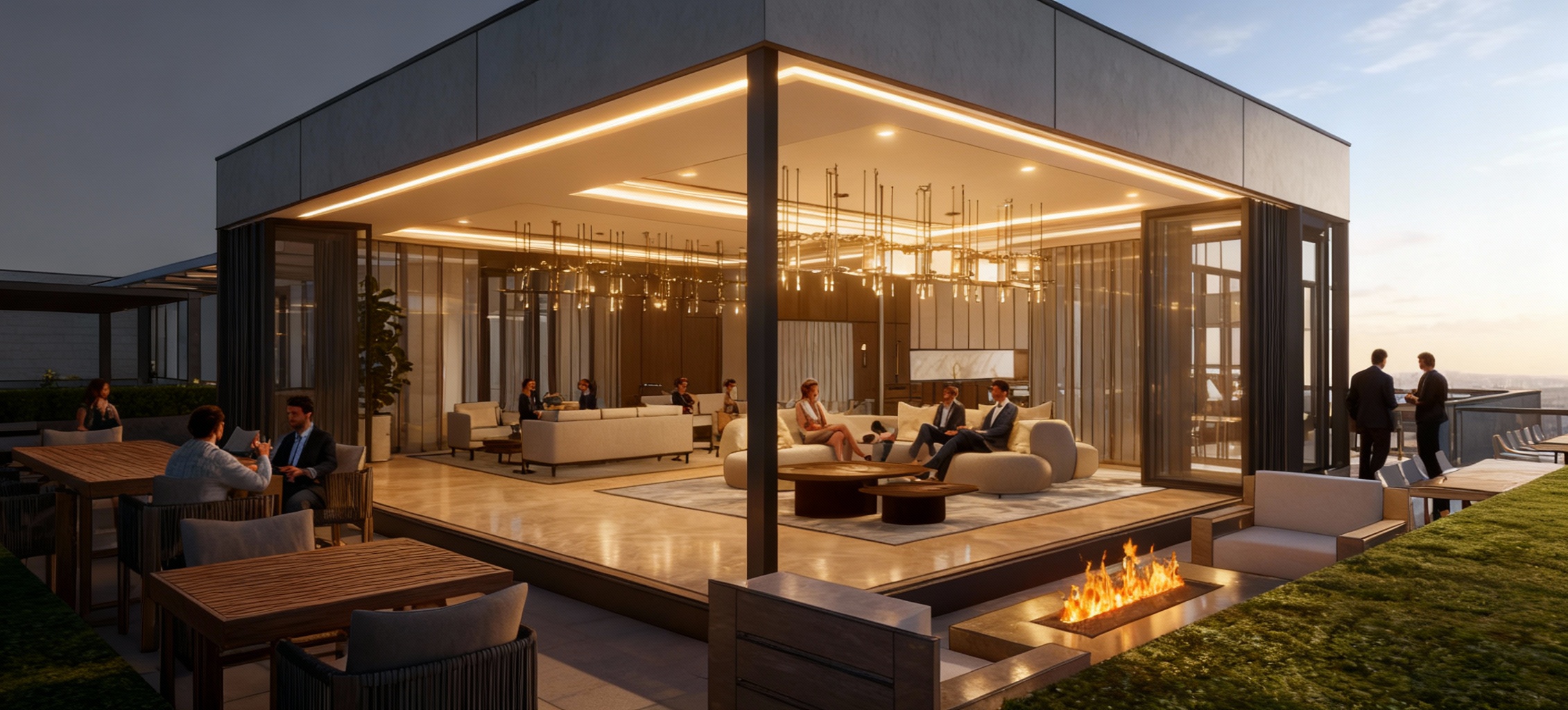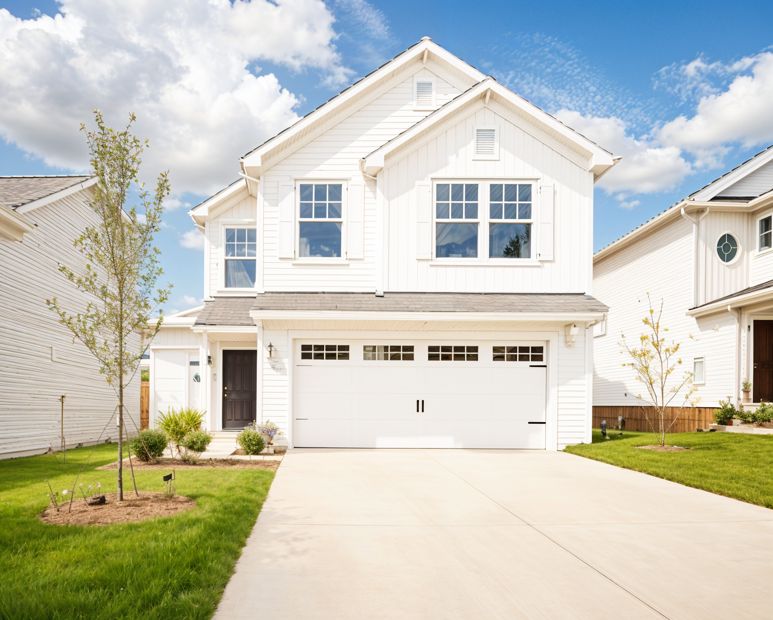 light gray stone for the base and main corner extending all the way up white composite panels with black accents trim canopies bands window frames shutters for the rest all garage doors should be solid black panels a lively ambiance snow day with people walking and warm interior lighting from within first floor shas only stairs going up