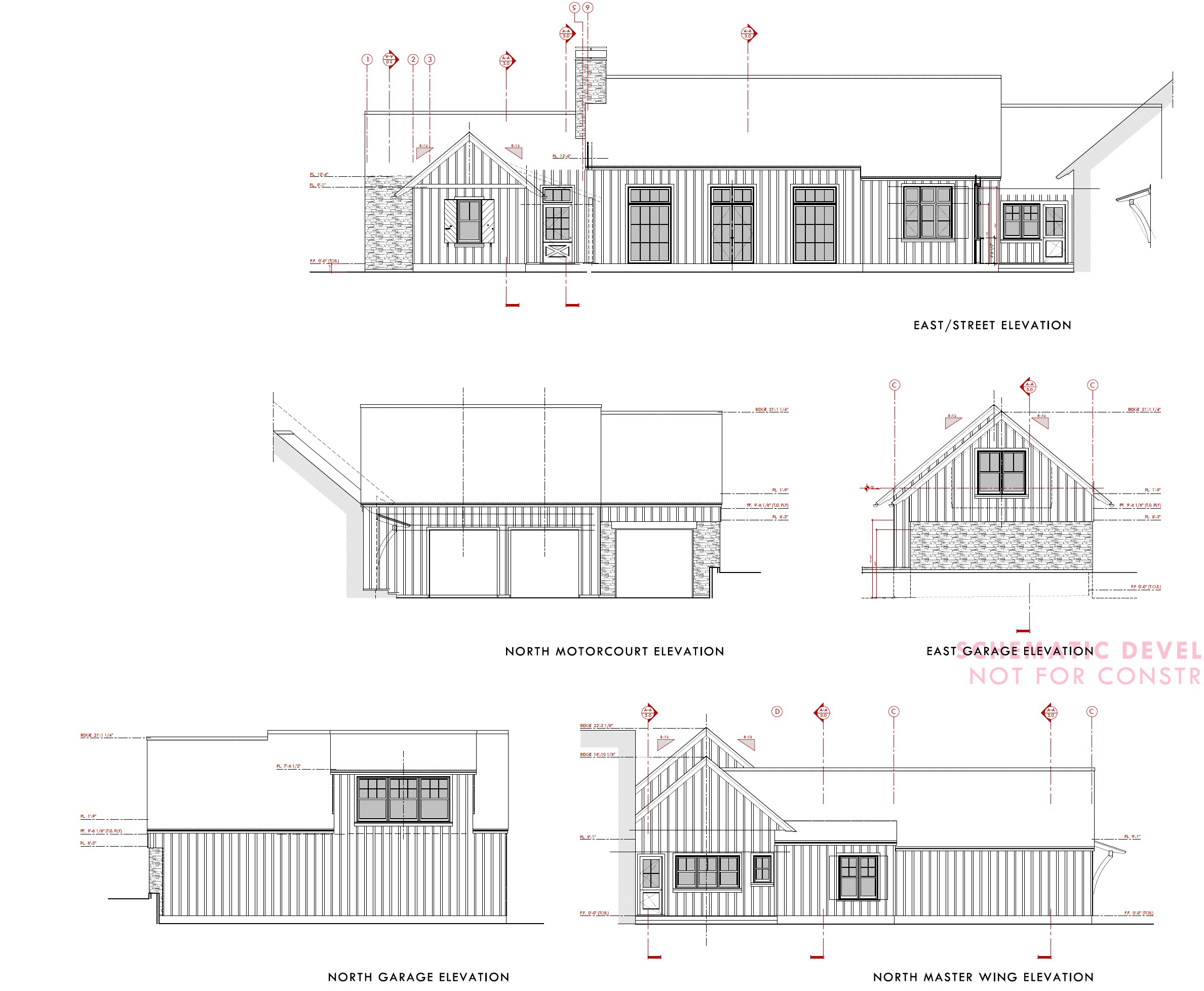 elevations of a dark grey board and batten ranch house with a corrugated metal roof set in the oak studded california hills